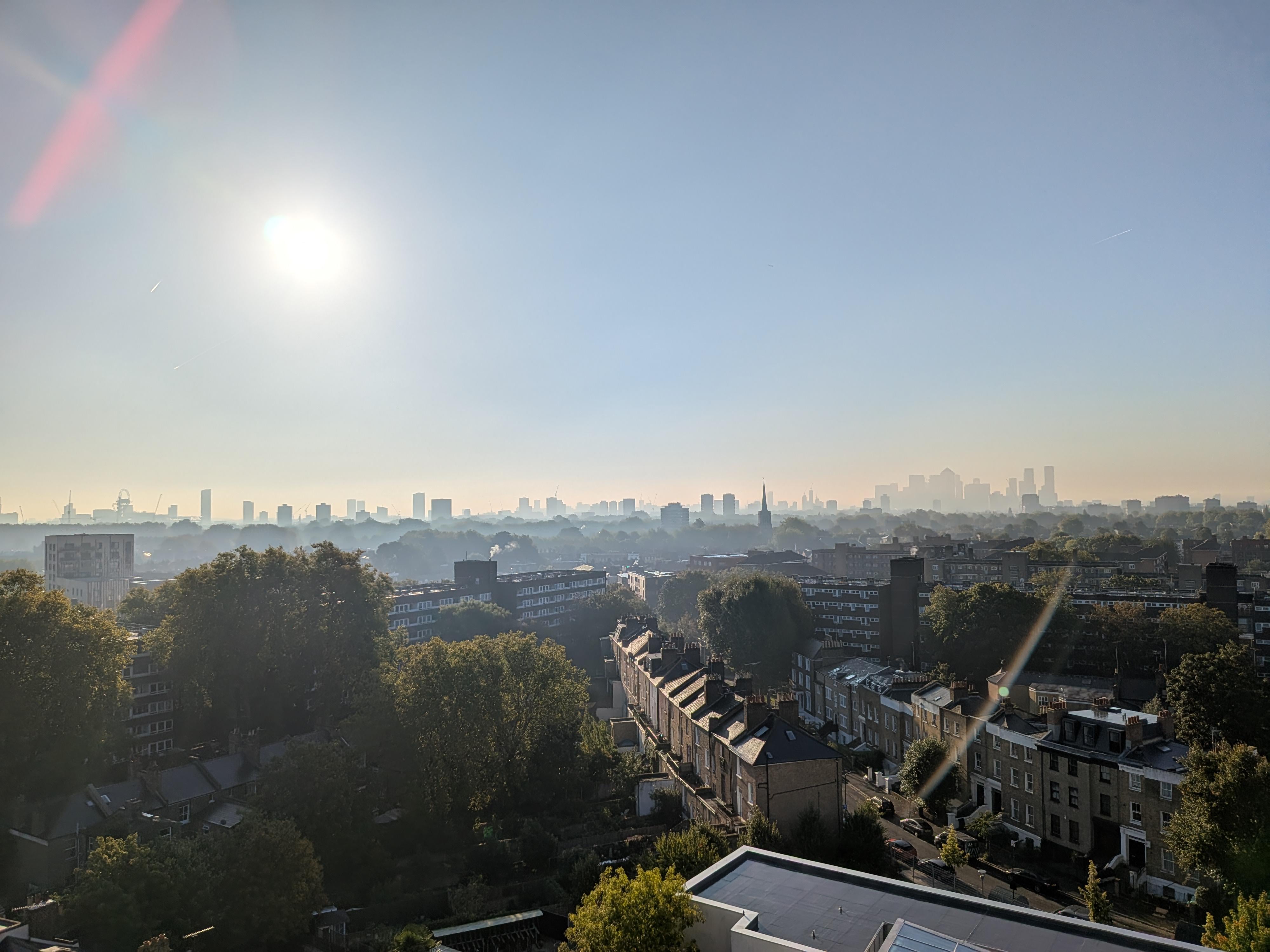 1. Lovely photo. Interesting angle too. Looks like Stratford on the left and Isle of Dogs on the right. So taken around Whitechapel or somewhere?