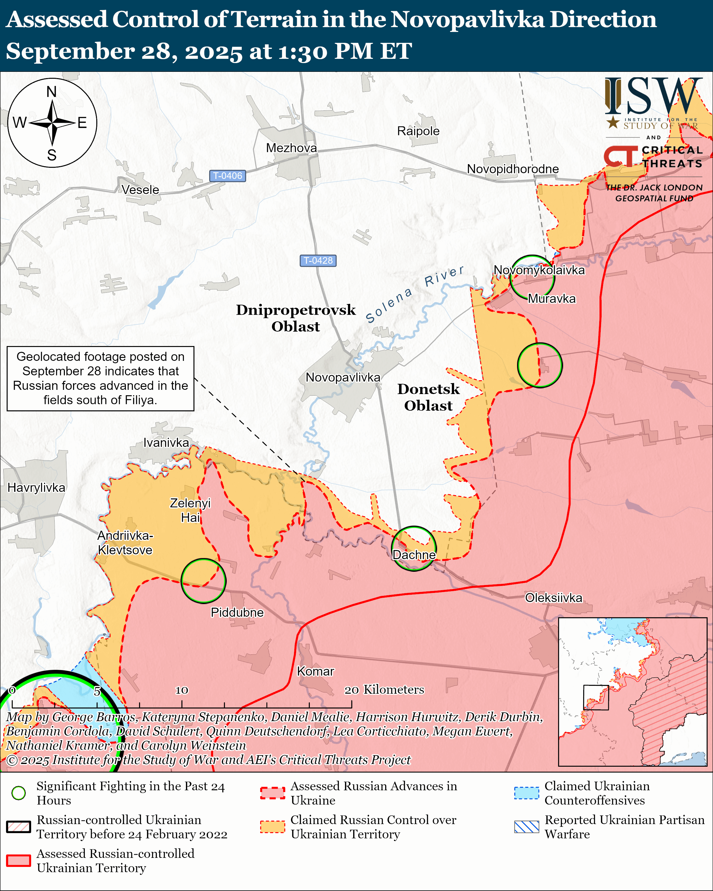 Assessed Russian advances: Geolocated footage published on September 28 indicates that Russian forces recently advanced south of Filiya (south of Novopavlivka).[61]