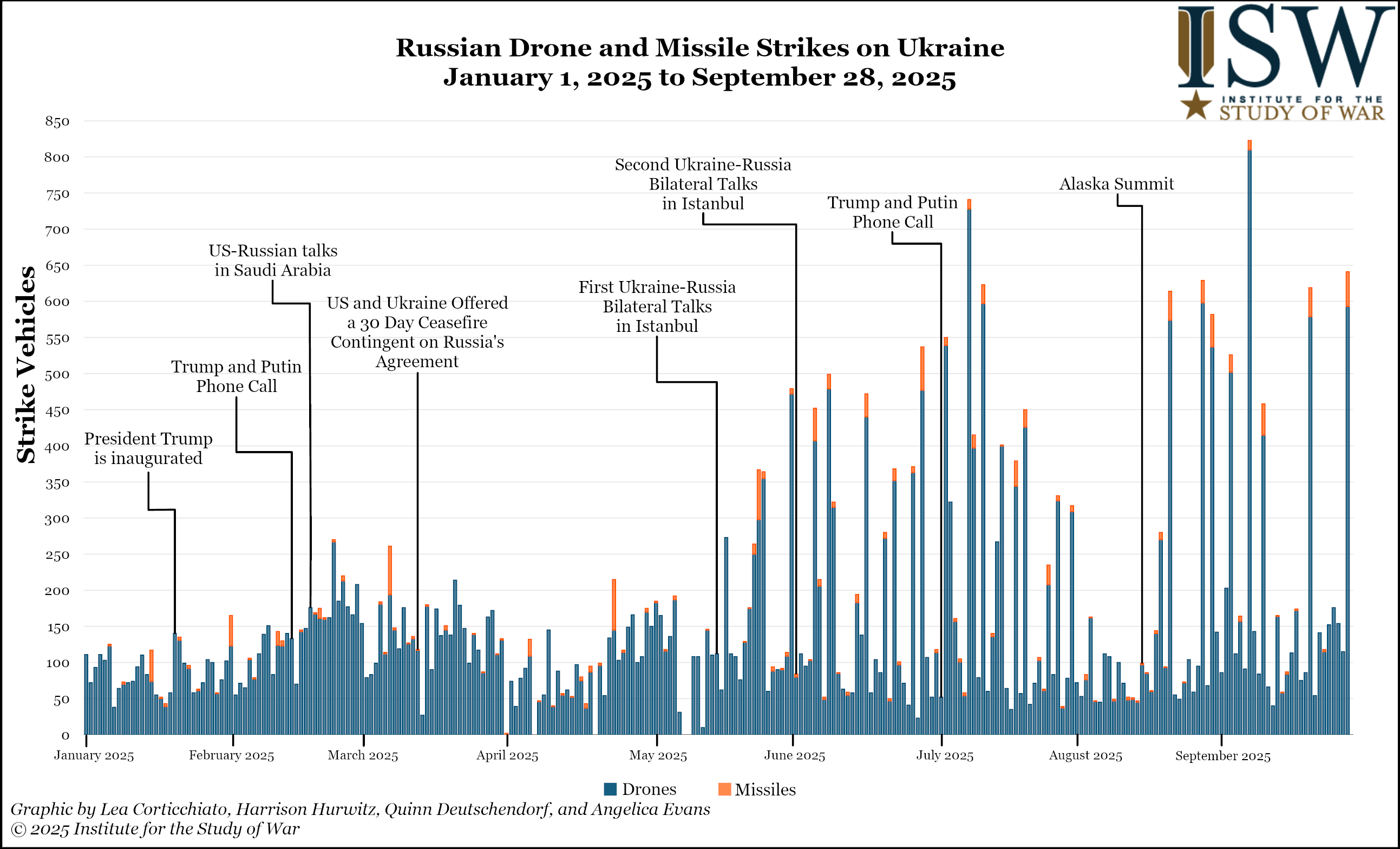 Russian forces conducted the third largest combined missile and drone strike against Ukraine of the war to date on the night of September 27 to 28 with 643 total projectiles. The Ukrainian Air Force reported that Russian forces launched two Kh-47M2 Kinzhal aeroballistic missiles from the airspace over Lipetsk Oblast; 38 Kh-101 cruise missiles from the airspace over Saratov Oblast; two drone-launched Banderol missiles from Kursk Oblast; and eight Kalibr cruise missiles from the Black Sea.[5] The Ukrainian Air Force reported that Russian forces also launched 593 Shahed-type, Gerbera-type, and other drones from the directions of Kursk, Bryansk, and Oryol cities; Millerovo, Rostov Oblast; Shatalovo, Smolensk Oblast; Primorsko-Akhtarsk, Krasnodar Krai; and occupied Cape Chauda and Kacha, Crimea. The Ukrainian Air Force reported that Ukrainian air defenses downed a total of 611 projectiles, including 566 drones; two drone-launched Banderol missiles; 35 Kh-101 cruise missiles; and eight Kalibr cruise missiles. The Ukrainian Air Force reported that five missiles and 31 drones struck 16 locations throughout Ukraine and that drone debris fell on 25 locations. Ukrainian President Volodymyr Zelensky reported that the Russian drones and missiles primarily struck civilian infrastructure in Kyiv City and Oblast and Zaporizhia, Khmelnytskyi, Sumy, Mykolaiv, Chernihiv, and Odesa oblasts and that the strikes lasted over 12 hours.[6] Zelensky reported that Russian strikes on Kyiv City killed four civilians and injured at least 40, including children. Kyiv Oblast Military Administration Head Mykola Kalashnyk reported that Russian strikes on Kyiv City left over 2,500 civilians without gas and roughly 580 civilians without electricity.[7] Zaporizhia Oblast Military Administration Head Ivan Fedorov reported that Russian forces struck Zaporizhzhia City with at least eight missiles, injuring 42 civilians and damaging civilian infrastructure.[8] Konotop City Mayor Artem Semenikhin reported that Russian forces appear to be adapting their drone strike tactics by circling Shahed-type drones over neighborhoods up to 12 times instead of striking immediately in order to terrify residents.[9] Poland’s Armed Forces Operational Command scrambled two fighter jets and put air defense on high alert on September 27 in response to Russia’s overnight strikes against Ukraine but did not report any violations of Polish airspace.[10] ISW continues to assess that Russian strikes are increasingly and disproportionately impacting civilian areas in Russia’s significantly larger-scale strike packages of recent months and that such strikes underscore Ukraine’s need for continued supply of Western air defense systems, especially US-provided Patriot systems.[11]