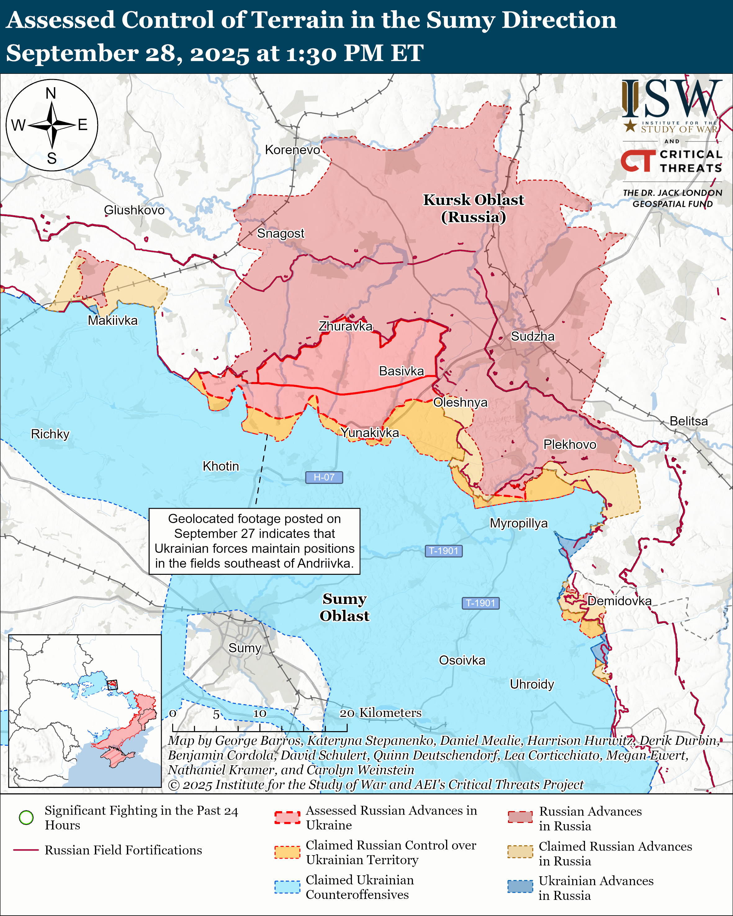 Refinement of area under Russian claims: Geolocated footage published on September 27 indicates that Russian claims that Russian forces seized positions southeast of Andriivka (north of Sumy City) are false and that Ukrainian forces maintained positions or advanced in the area.[25]