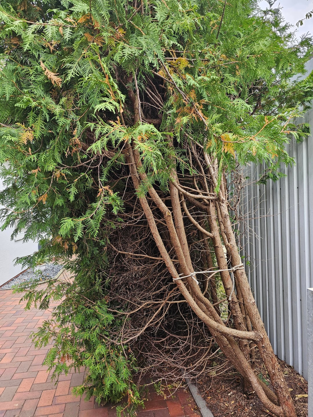 Hachja, Thuja..ich fürchte, wenn du da was trimmst besteht der Sichtschutz nur noch aus braunem Altholz. Ich würde sagen so belassen bis es ganz raus kommt – oder dann eben ohne Sichtschutz bis ne Alternative da ist.