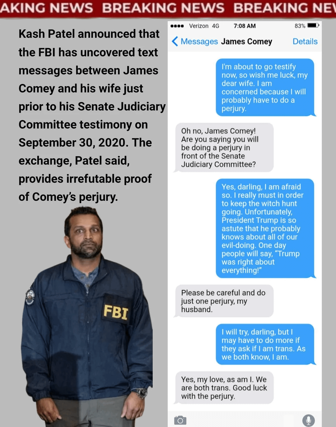 “I hope they never appoint Kash Patel as fbi director or we are both screwed. Along with Hilary and these democrats I conspired with.” Please see attached bullets