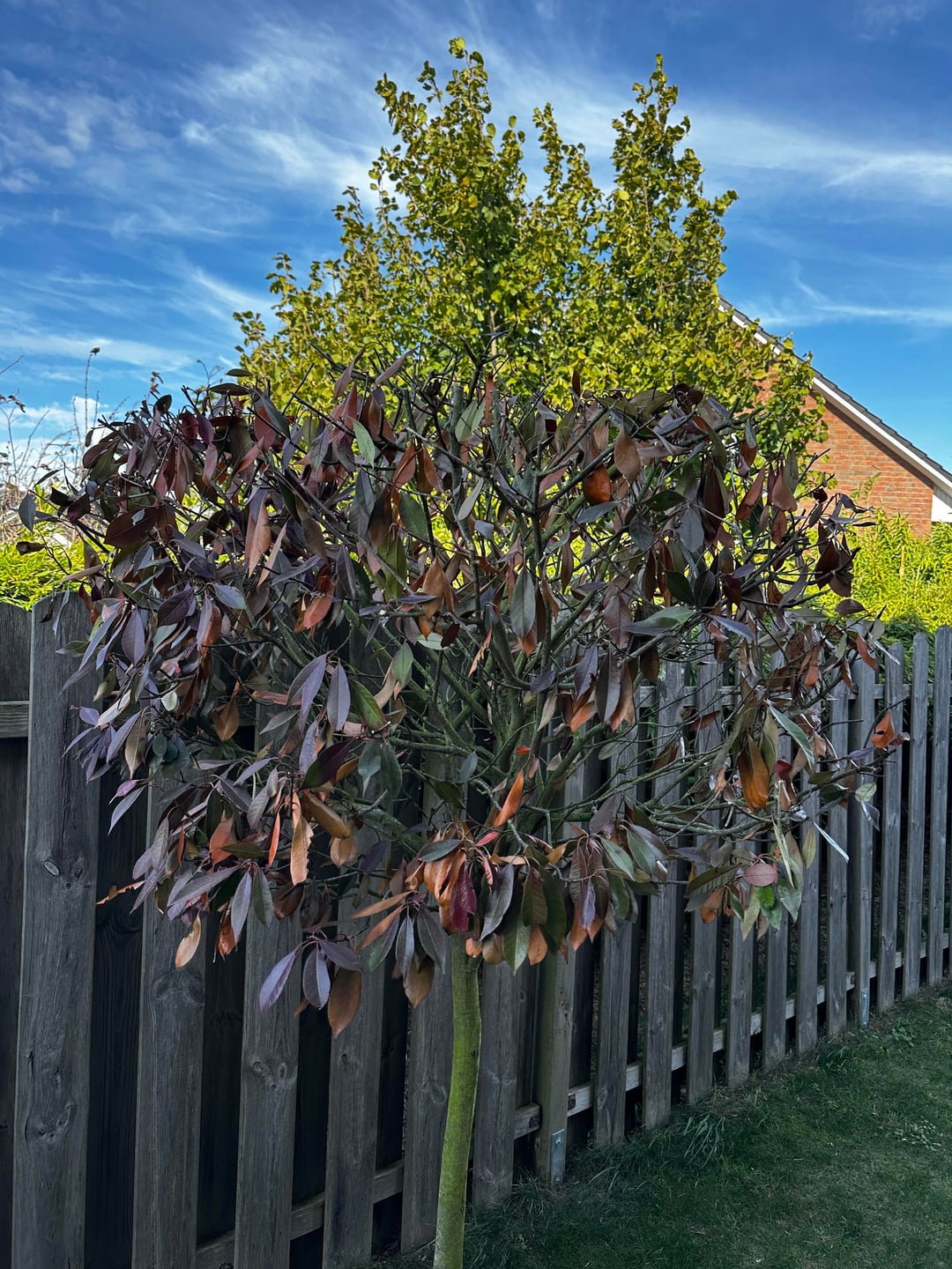 Uh schwer zu sagen. War es die Nächte bei euch mal sehr kalt? Um die 0 Grad oder weniger? Auf dem ersten Blick schaut es aus als hätte er Frost ab bekommen. Wundert mich nur das er umlaufend Braun geworden ist. Meistens ist nur die Wetterseite betroffen. Der andere Busch steht durch den Schuppen(?) Warscheinlich geschützter und ist deswegen noch gut drauf.