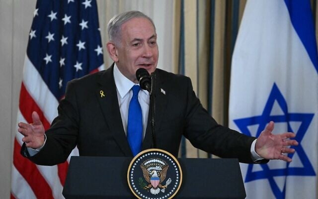 Prime Minister Benjamin Netanyahu participates in a joint press conference with US President Donald Trump (off frame) in the State Dining Room of the White House in Washington, DC, on September 29, 2025. (ANDREW CABALLERO-REYNOLDS / AFP)