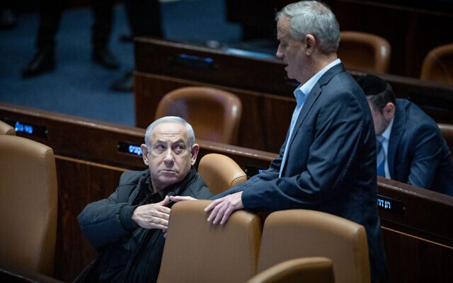 Then-Minister Benny Gantz, right, shakes hands with Prime Minister Benjamin Netanyahu in the Knesset in Jerusalem, December 25, 2023. (Yonatan Sindel/Flash90)