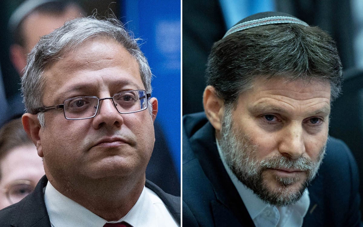 Left: National Security Minister Itamar Ben Gvir, January 16, 2025; Right: Finance Minister Bezalel Smotrich, January 13, 2025. (Both photos by Yonatan Sindel/Flash90)
