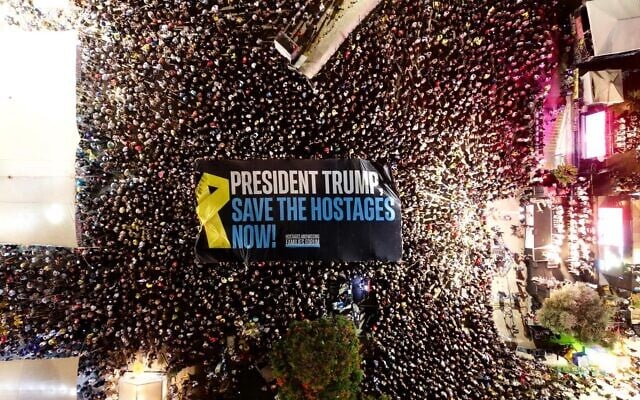 A massive banner calling for US President Donald Trump to push a hostage deal in Gaza is unfurled at Hostages Square in Tel Aviv during a rally on September 6, 2025. (OM/Hostages Families Forum)