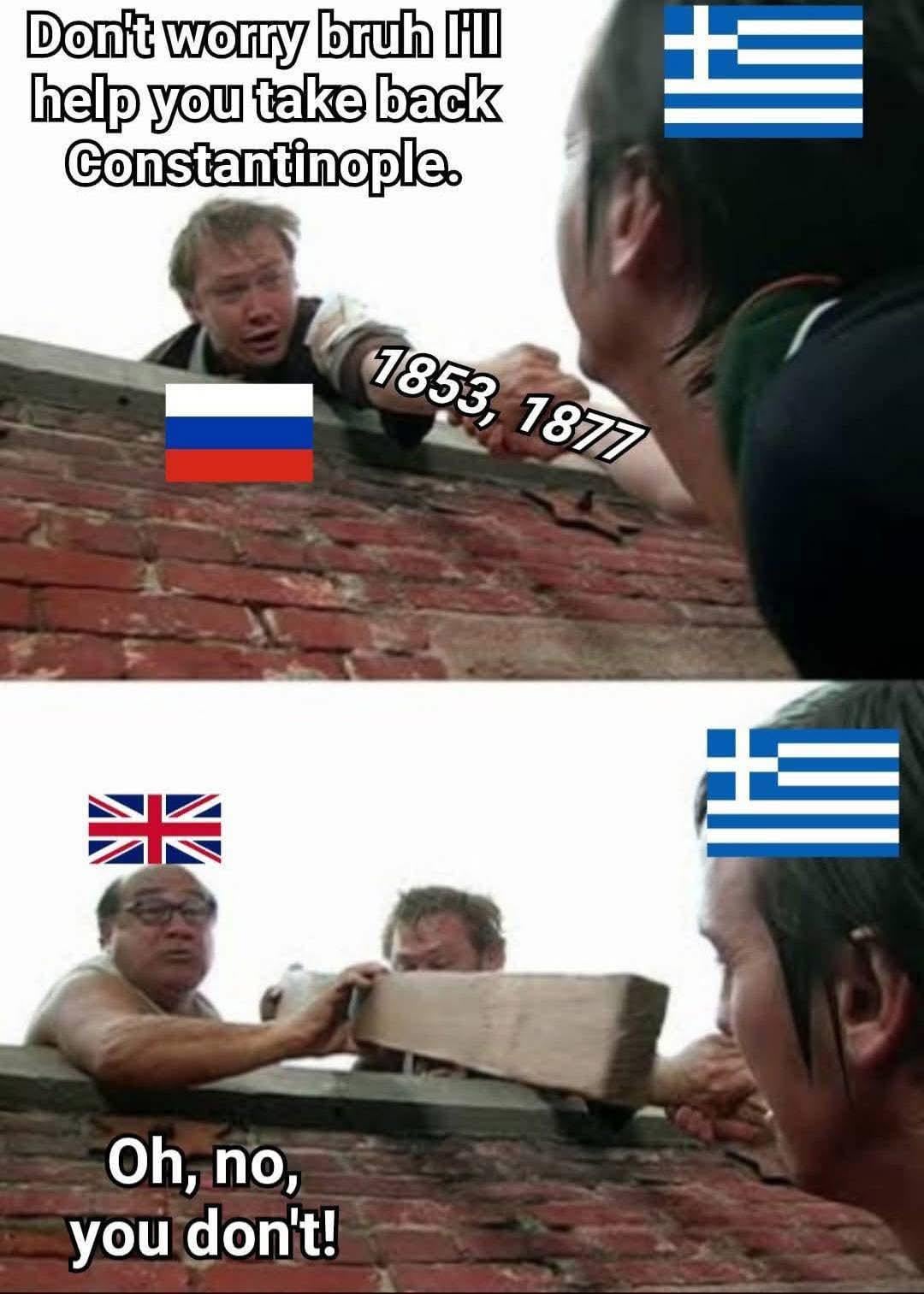 Pfft yeah the Russians were going to give the link between the Black sea and the Mediterranean to the Greeks totally just ignore the fact they’ve been eyeing Constantinople since its fall for religious and later strategic reasons