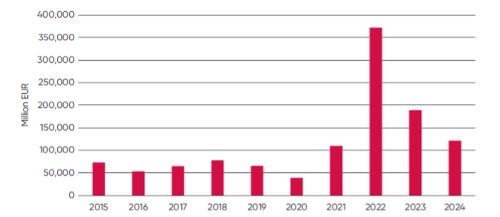 Figure 1: Value of EU Natural Gas Imports (Million EUR) & Volume of Russian Gas Imports into the EU