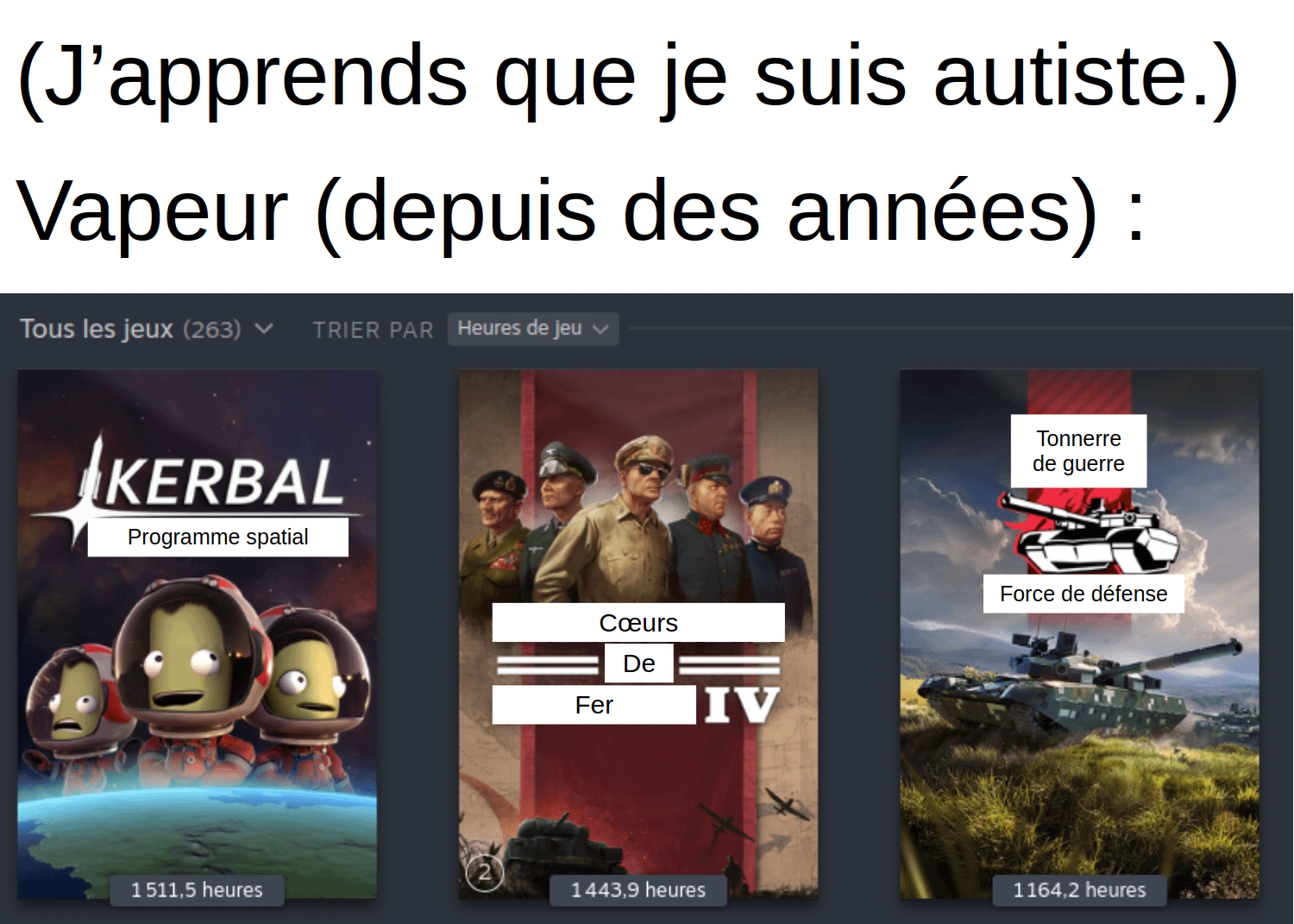 Puis-je humblement conseiller ~~Dwarf Fortress~~ Forteresse Naine comme jeu par autiste pour autiste? Surtout maintenant que la version sur Vapeur est plus accrocheuse, parce que les graphismes à base de caractères, j’aimais bien, mais c’était tendu d’attirer les copains dessus.