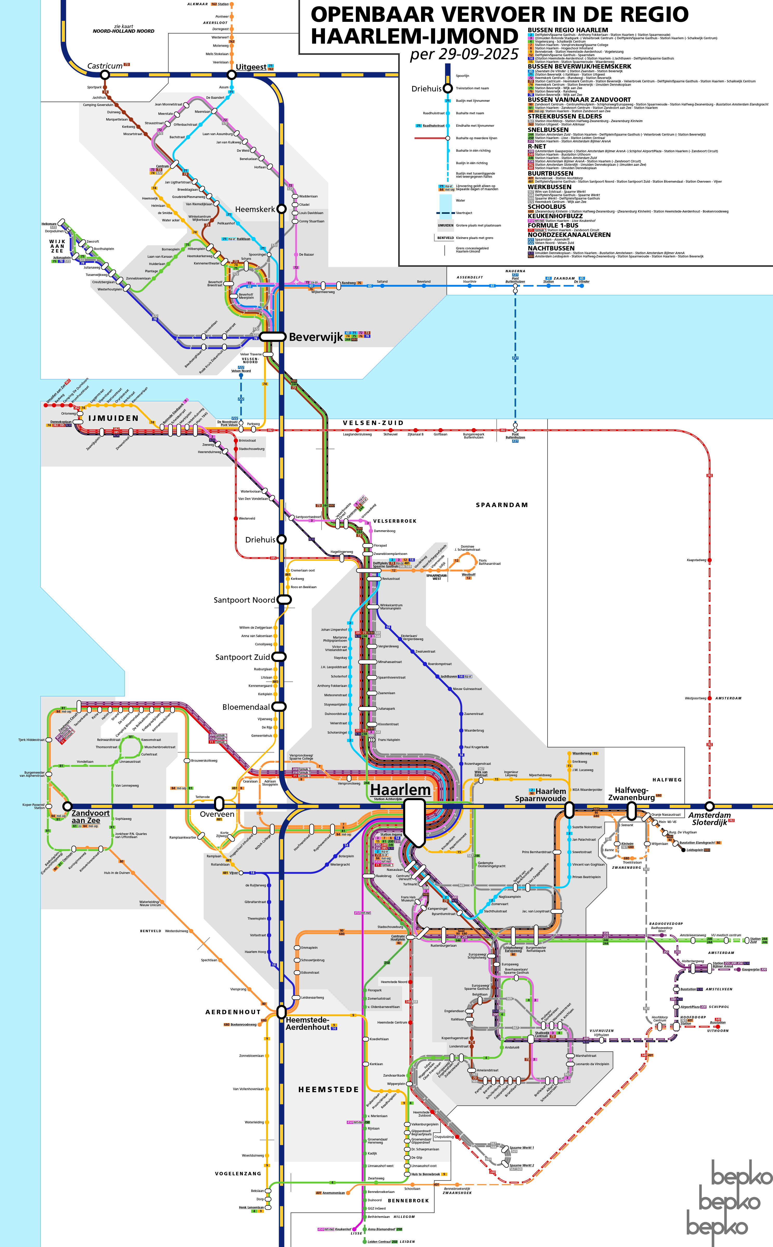 Hallo, dit is een schematische kaart van het openbaarvervoersnetwerk van de regio Haarlem-IJmond, 1 van de [28 concessiegebieden](https://wiki.ovinnederland.nl/wiki/Concessiekaart) die ons land telt. Het is een beetje het vervolg op [mijn kaart van Noord-Holland Noord](https://www.reddit.com/r/thenetherlands/comments/1de8xz1/oc_kaart_van_het_ov_in_noordholland_noord_in/), die ik hier vorig jaar postte. Dit gebied is iets kleiner in omvang dan Noord-Holland Noord, wat ook wel hielp wat betreft de tijd die het kostte om het te maken (9 maanden tegenover 4 jaar, al heb ik bij beide ook wel langere pauzes gehad), al helpt de ervaring die ik bij die kaart opdeed natuurlijk ook zeker.