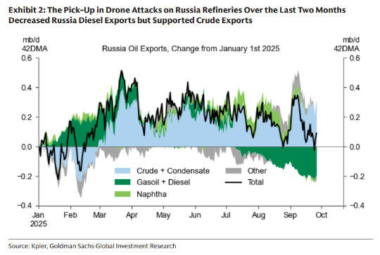Ukraine’s strategy of attacking Russian energy assets, and in particular, refineries, has led to a significant decline in Russia’s operable capacity. This, in turn, has led to two spillover effects. Because of domestic shortages, a partial ban of diesel exports has been enacted. At the same time, crude oil exports have increased (despite existing sanctions).