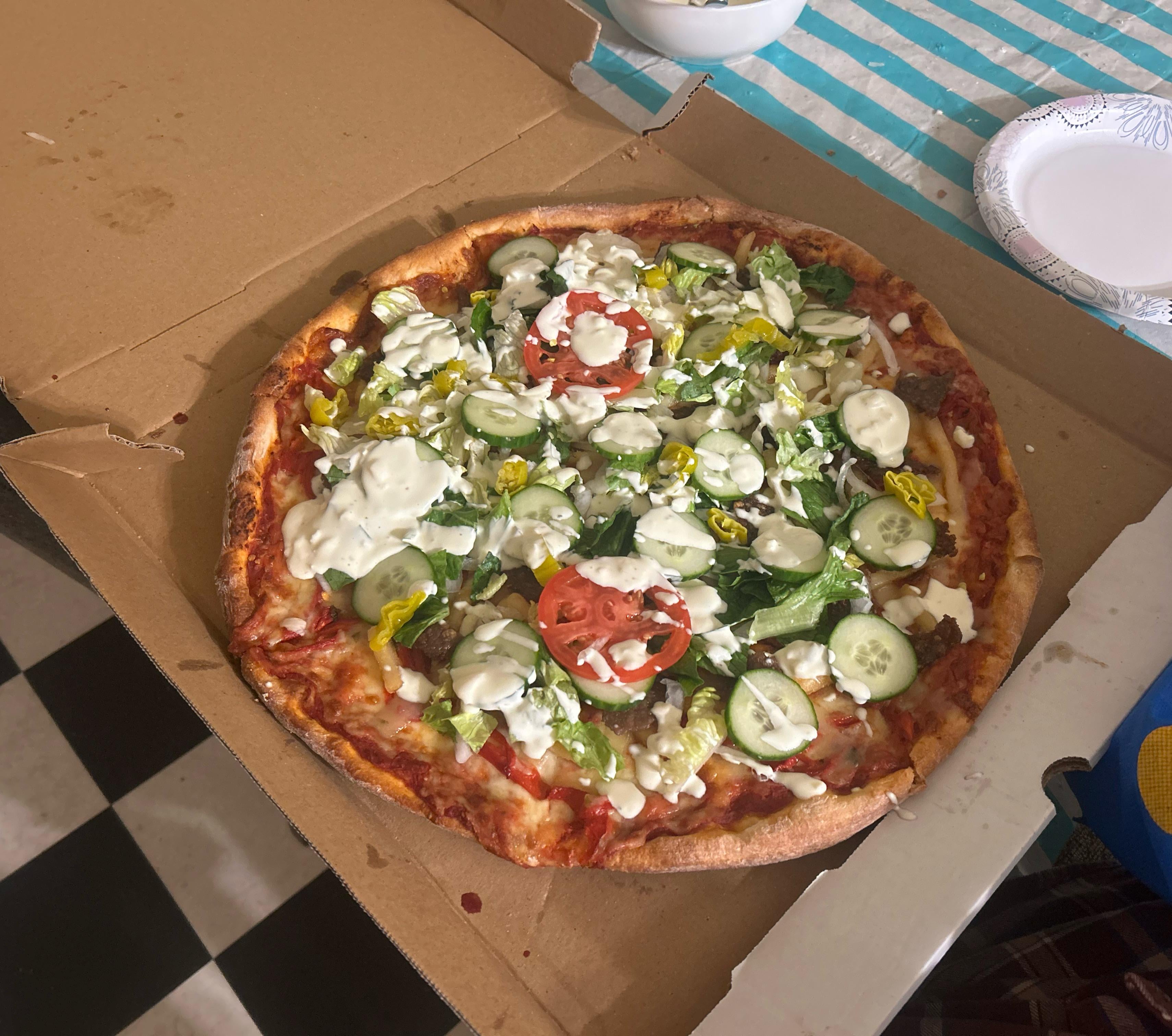 I ordered a half baked pizza, put kebab meat and fries with extra cheese, rebaked. Then added lettuce, tomato (2), peperoncini, cucumber, and garlic sauce.