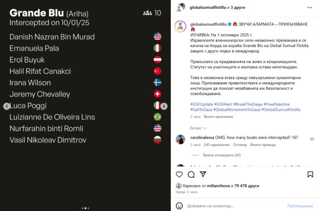 A Bulgarian citizen is among those detained after Israeli naval forces intercepted ships from the humanitarian flotilla “Global Sumud,” which attempted to break the blockade of Gaza. According to information published on the flotilla’s official social media channels, Vasil Nikolaev Dimitrov was on board and taken into custody during the operation. While the Bulgarian Ministry of Foreign Affairs has so far declined to comment, the incident has drawn wide international attention.