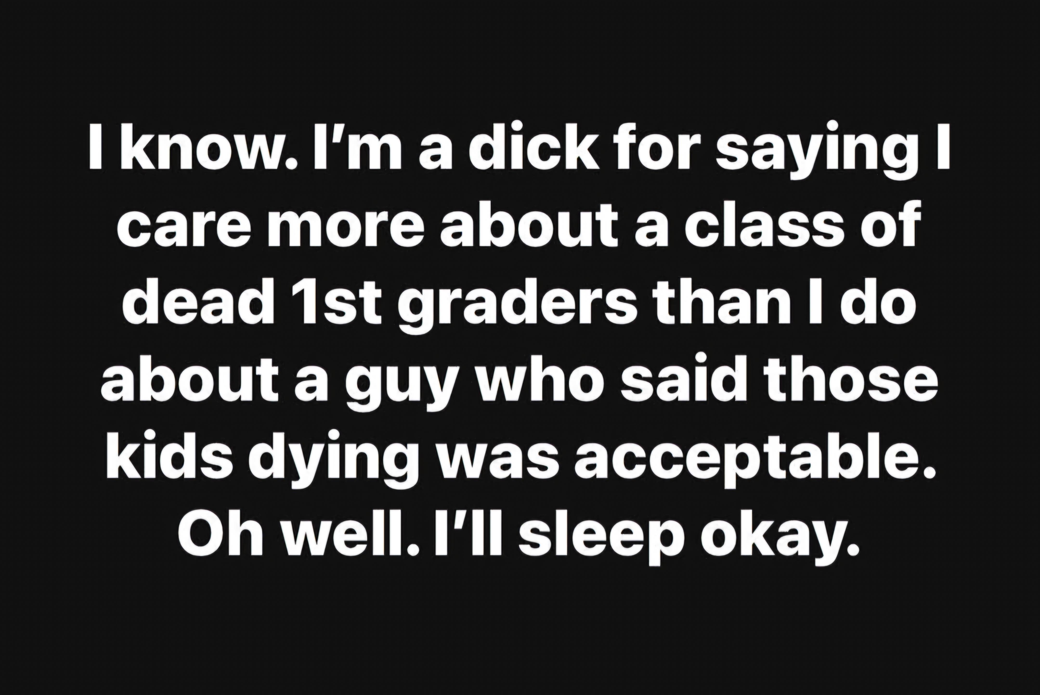 I made this point on FB the other day and of course got buried in outraged comments for it. I don’t have any tears for a person who wouldn’t care whatsoever if my child was shot dead at her school as long as it meant these lunatics were allowed to keep their guns. My daughter’s life is worth infinitely more than a college dropout podcaster who made a living bullying college students. At the very least she has potential to do something good for the world.