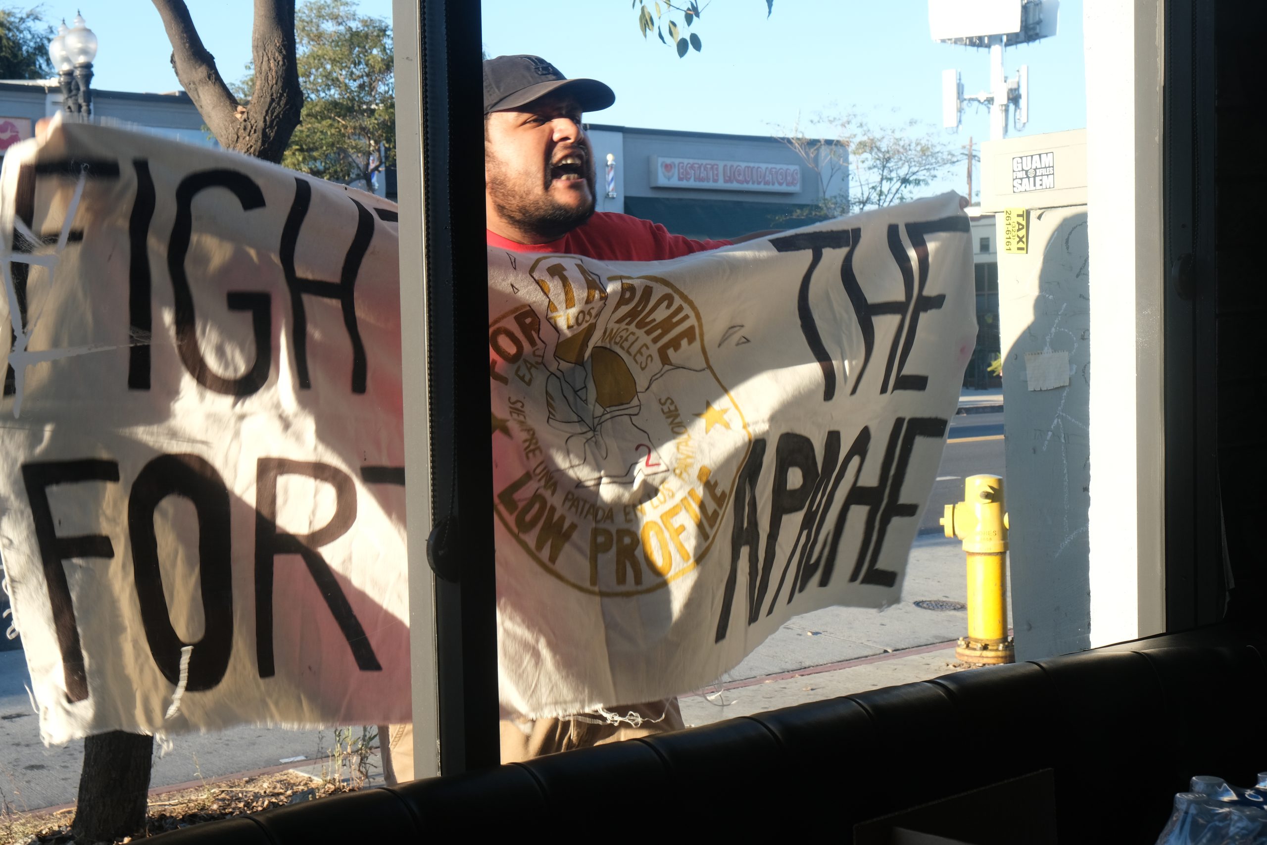 As the event got started, Gabriel Quiroz of the social justice group Centro CSO, approached Hochman and unfurled a banner that read, “Fight The Fort Apache,” referring to a logo of a riot helmet atop a boot that the Sheriff’s East L.A. station has used.