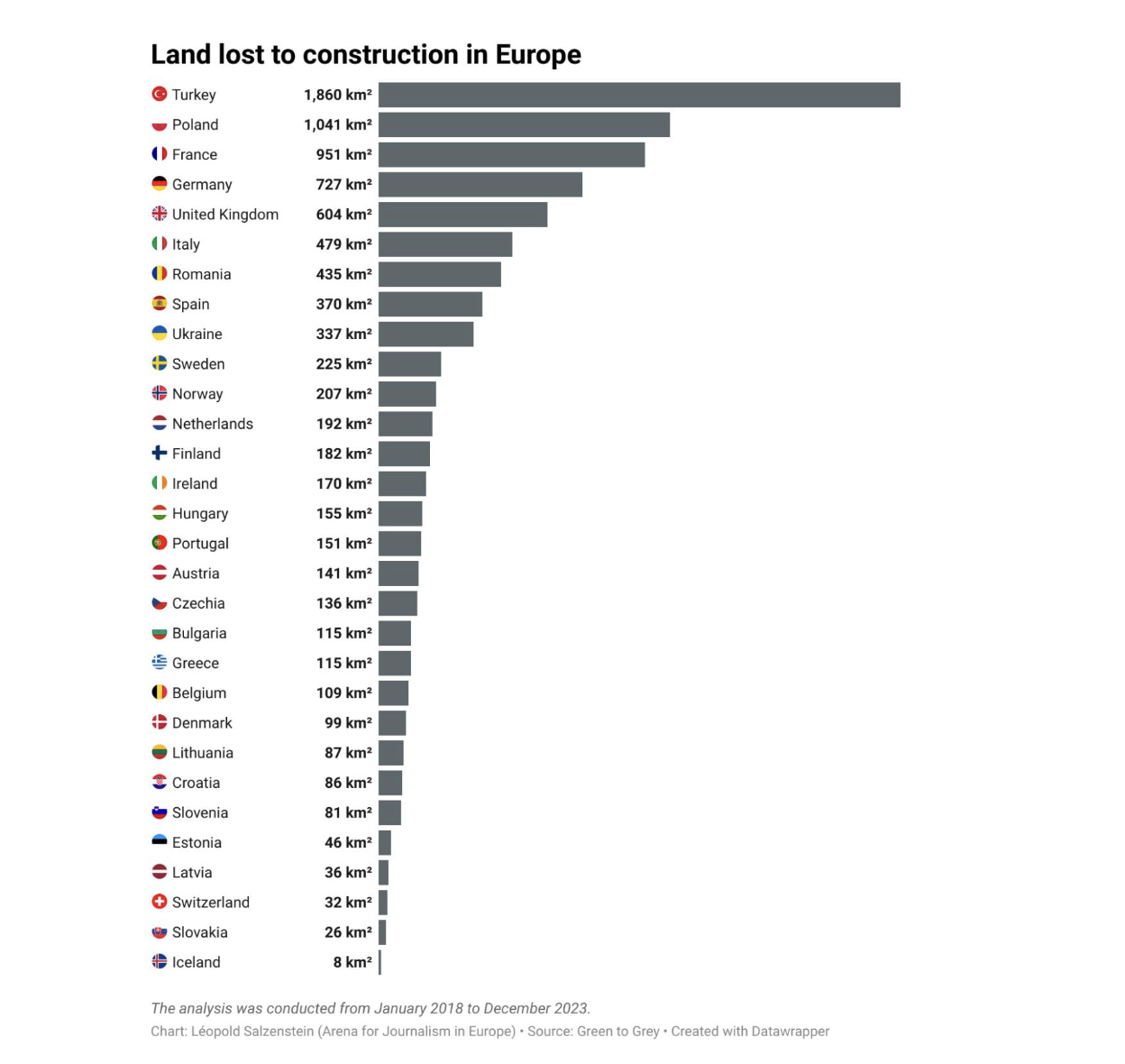 In absolute terms, Turkey tops the list with 1,860km² of nature and cropland lost between 2018 and 2023, an area bigger than Greater London. Poland is next with more than 1,000km² lost, followed by France and then Germany.