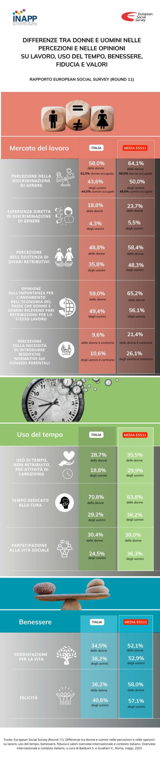 Queste sono alcune delle evidenze che emergono dall’undicesimo round della European Social Survey, un’indagine statistica comparata, che sulla base dei dati disponibili a maggio 2025, ha visto la partecipazione di oltre 40.000 persone – di cui 2.865 in Italia – di età pari o superiore 15 anni, residenti in 24 Paesi europei (non solo membri dell’Unione europea). II Rapporto nazionale sul Round 11 realizzato dall’Inapp approfondisce, in una prospettiva comparata europea, i temi della partecipazione al mercato del lavoro, l’uso del tempo, le determinanti del benessere, della soddisfazione e della fiducia, le prospettive valoriali, utilizzando la dimensione di genere come chiave di lettura trasversale.