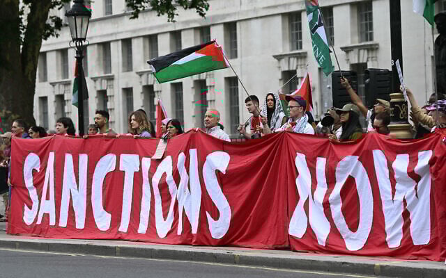 Protesters hold a banner calling for sanctions to be placed on Israel during a demonstration in support of Palestinians in Gaza, in London on July 29, 2025. (Justin Tallis / AFP)