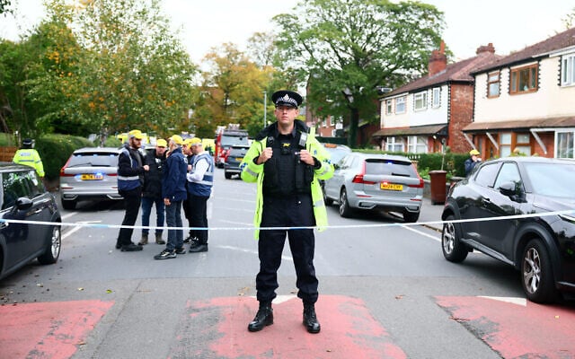 A police officer stands on duty at a cordon near Heaton Park Hebrew Congregation synagogue in Crumpsall, north Manchester, on October 2, 2025 (Paul Currie / AFP)