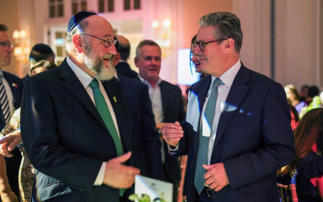 British Prime Minister Keir Starmer speaks with Chief Rabbi Ephraim Mirvis, at the Holocaust Education Trust appeal dinner, in London, Monday, Sept. 16, 2024. (Isabel Infantes/Pool via AP)