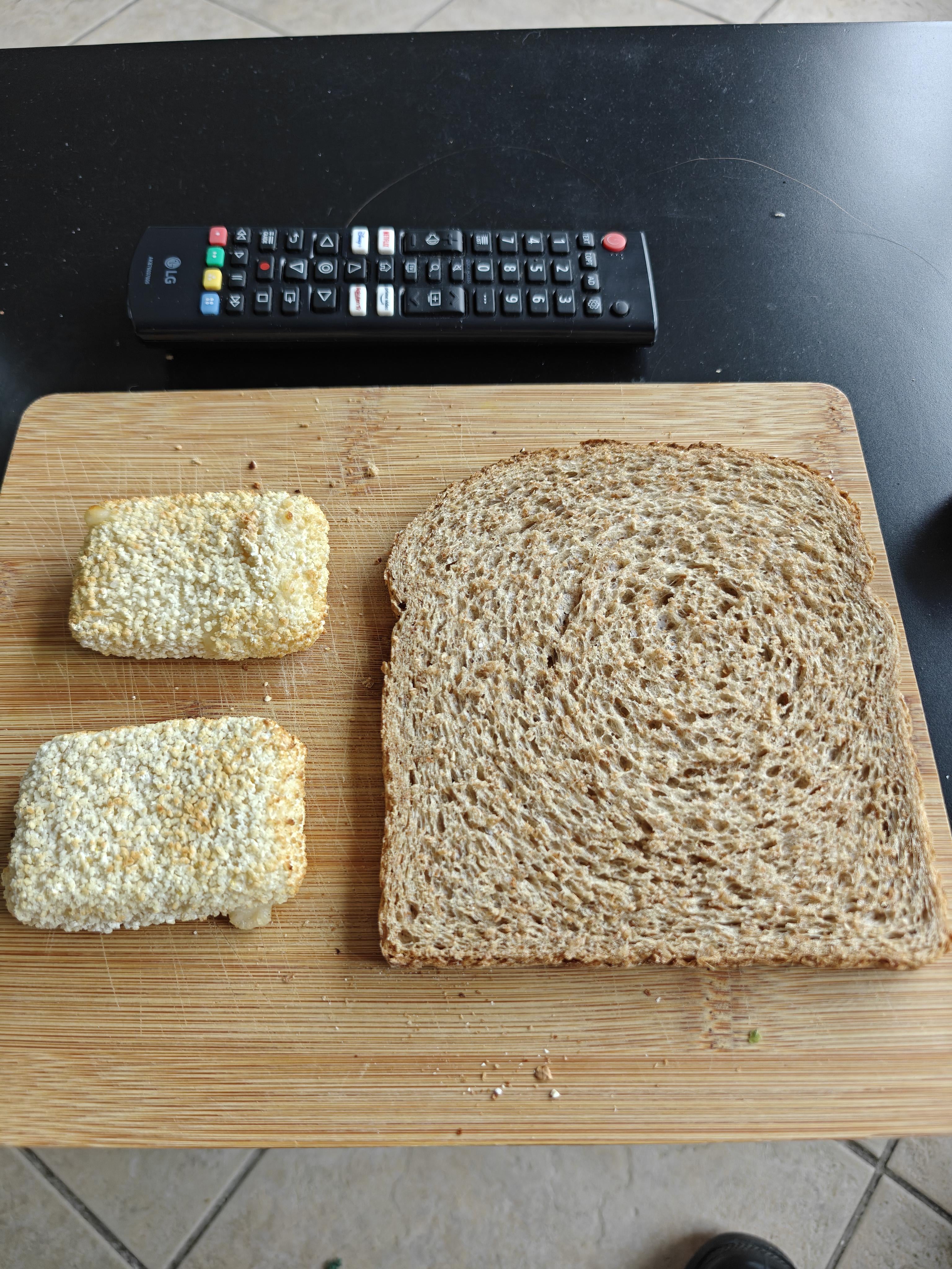 Je kon toch op zijn minst een witte boterham genomen hebben. Zo een uit de supermarkt die 3 weken goed blijft. Nu zit je daar gezonde vezels te eten. Als je er voor gaat, ga er dan ook voor.