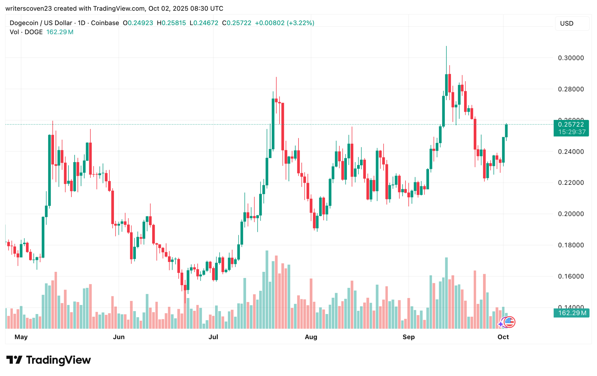 Dogecoin has recently rallied from mid $0.20 support toward the $0.25–$0.30 band as memecoin rotation and ETF-related flows lift bids across the sector. Intraday technicals show DOGE hovering above key moving averages, which, if held, could open room for a 30–55% extension toward resistance near $0.29–$0.35.