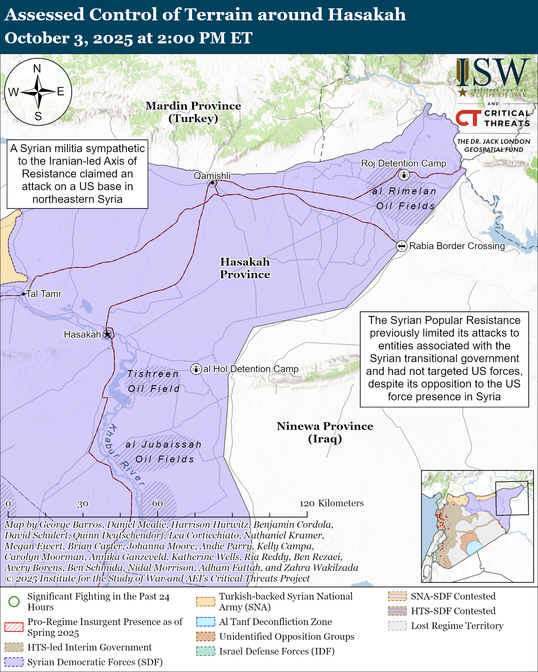 A Syrian militia sympathetic to the Iranian-led Axis of Resistance claimed an attack on a US base in northeastern Syria on October 2.[i] This attack marks the first time that the militia has claimed to attack US forces. The Syrian Popular Resistance announced that it and “allied forces” targeted US forces with unspecified weapons south of Hasakah City.[ii] Syrian social media accounts posted videos purporting to show US air defense systems activating over al Shaddadi Base, Hasakah Province, on October 2.[iii] The United States has not confirmed the attack at the time of this writing and CTP-ISW is unable to independently verify the group’s claim.