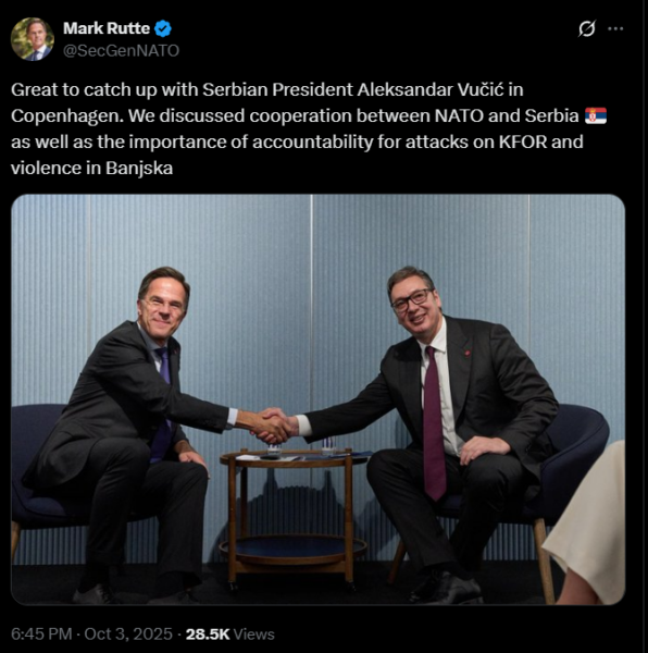 Le secrétaire général de l’OTAN, Mark Rutte, a annoncé qu’il avait rencontré le président serbe Aleksandar Vučić à Copenhague.