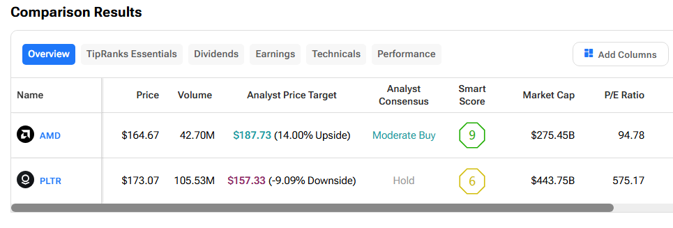 Using TipRanks’ Stock Comparison Tool, we compared AMD and PLTR to see which AI stock analysts currently favor. AMD holds a Moderate Buy consensus rating, with an average price target of $187.73, indicating about 14% upside from current levels. In contrast, Palantir has a Hold rating, with an average price target of $157.33, implying roughly 9% downside.
