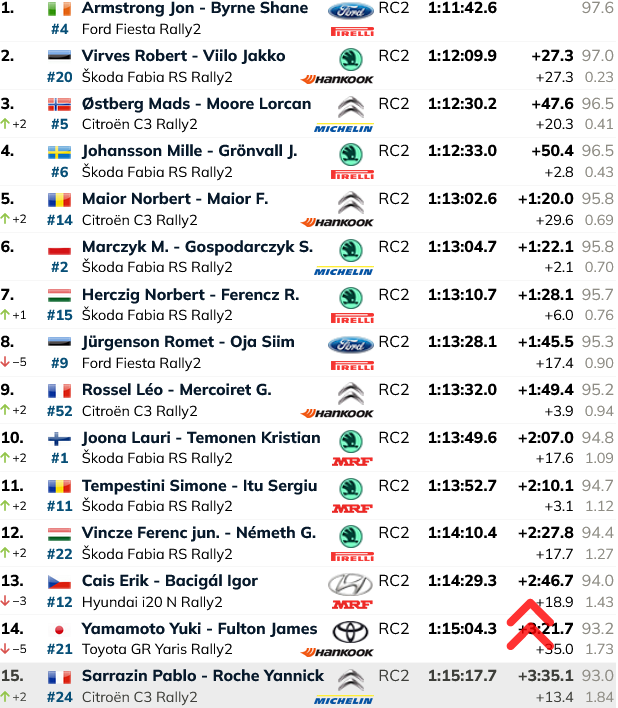 On the French side, Adrien fourmaux took advantage of the day to carry out tests in preparation for the Central European Rally (October 15-19). Alone in the Rally1 category, it is difficult to truly assess his performances. Those of Pablo Sarrazin (C3) were more telling. The young Frenchman had a complicated start to the stage with a puncture (SS1), a small mistake (SS3) and a gate in love with freedom (SS4). His 9e chrono in the 5e ES confirmed his rise to power. Also new to the event, Léo Rossel showed consistency. Although a former French asphalt champion, the Gard native inherited an indecent and incomprehensible 50e place on the road which did not make his task easy. Despite everything, the PH-Sport driver put in significant performances and finished Saturday in 9th place.