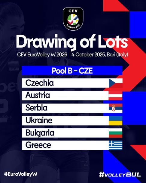 България ще се изправи срещу Австрия, европейския вицешампион Сърбия, Украйна, Гърция и домакина Чехия в груповата фаза на Евро 2026 по волейбол при жените, отреди тегленият в италианския град Бари жребий. Мачовете от група “В” с участието на българския отбор ще се играят в чешкия град Бърно. Европейското първенство ще се проведе между 21 август и 6 септември в Турция, Чехия, Азербайджан и Швеция.