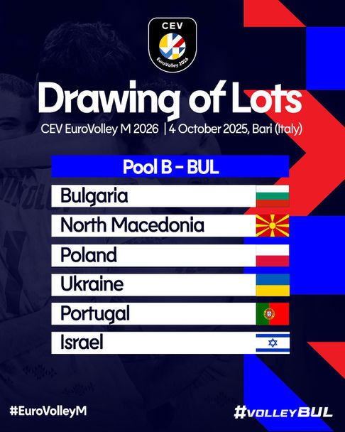 Световният вицешампион България ще се изправи срещу Република Северна Македония, европейския първенец Полша, Португалия, Украйна и Израел в груповата фаза на Евро 2026 по волейбол за мъже, отреди тегленият в италианския град Бари жребий.