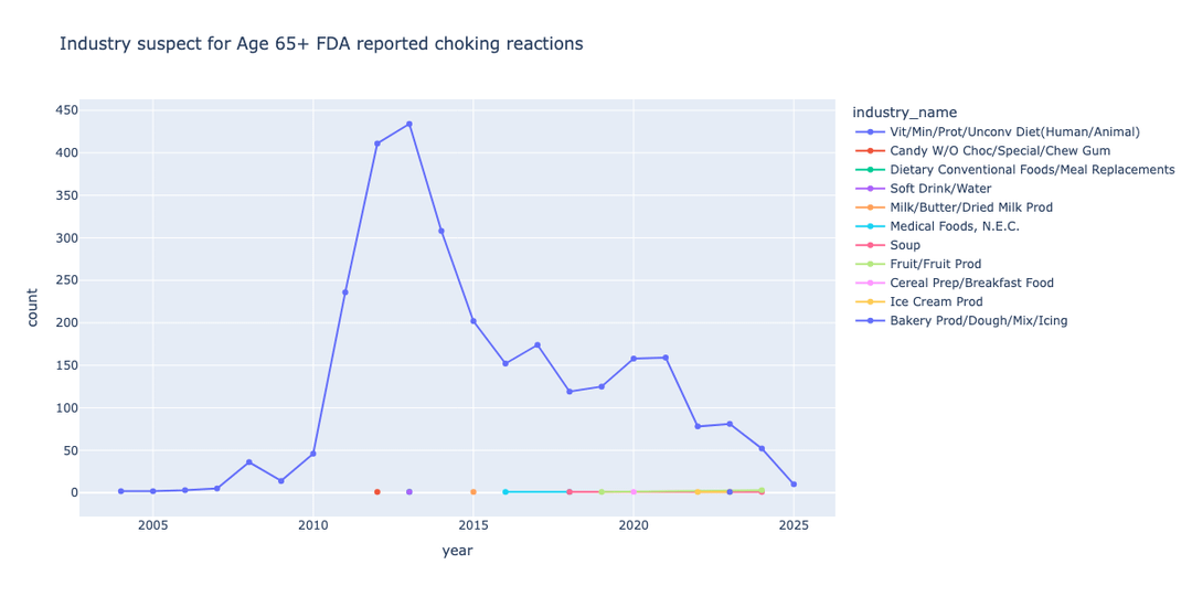 Some of you may have seen a post a few days ago about a sudden spike in reported choking events for people age 65+. Kinda interesting, and a lot of community feedback about possible problems with the data and some expected jokes about the likely culprit (Werther's, Nutella, transparent lifesavers, etc).