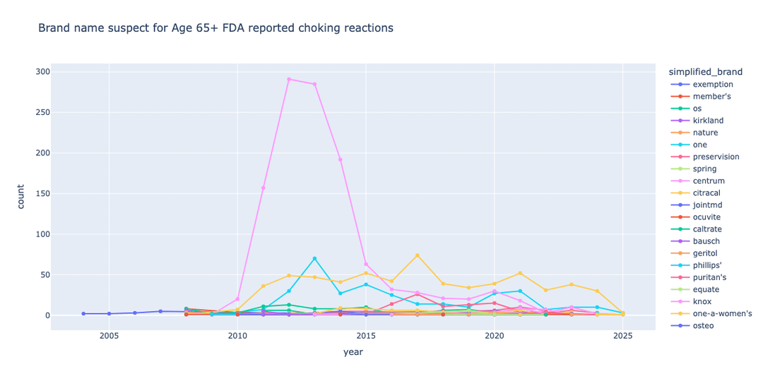 Short answer? It’s multi-vitamins (first plot), specifically Centrum multi-vitamins (second plot). I don’t know about the timing, but [2012 does align with the release](https://www.nytimes.com/2012/10/18/health/daily-multivitamin-may-reduce-cancer-risk-clinical-trial-finds.html?unlocked_article_code=1.q08.VP34.031yE7YK_knF&smid=url-share) of a now [largely debunked study](https://pmc.ncbi.nlm.nih.gov/articles/PMC8754570/) linking Centrum multi-vitamin use to a decrease in cancer rates. Not sure about why the spike actually seems to start in 2011, but could be something off with the timing of the reports to the FDA