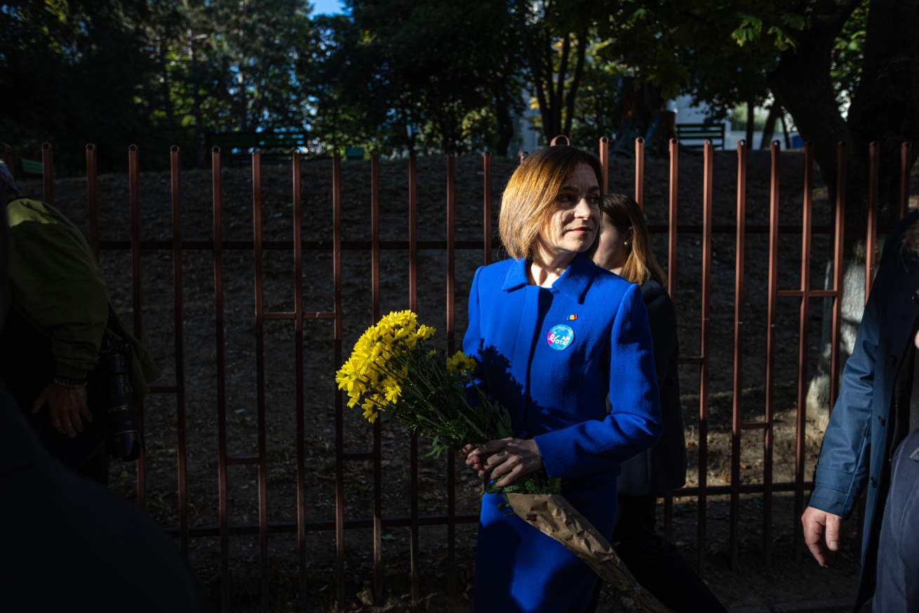 Moldovan President Maia Sandu leaves the polling station after voting in the morning in Chișinău. Photo © Théo Prouvost