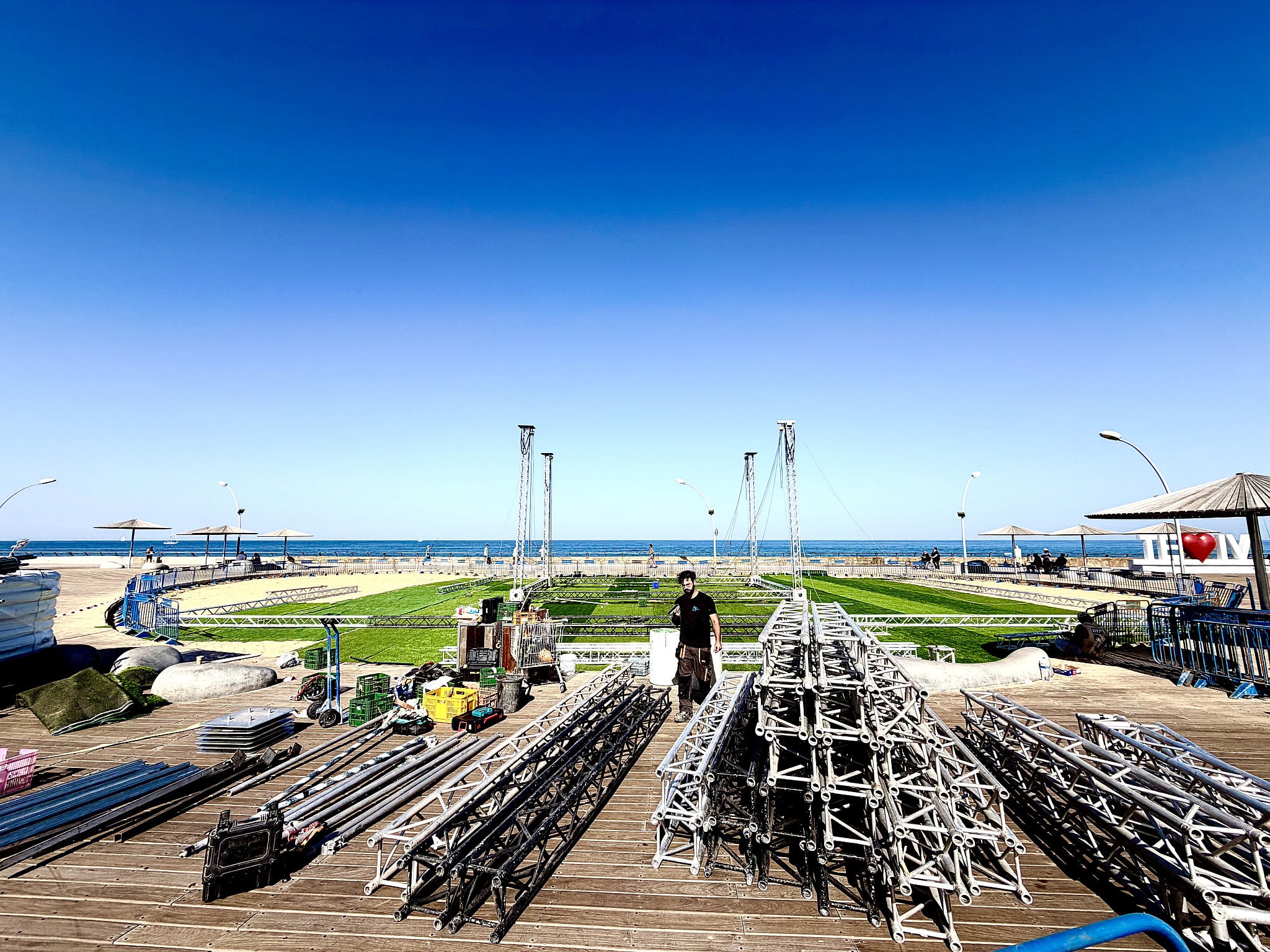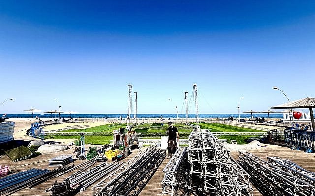 Construction begins on Yahaduta’s ‘Israeli Sukkah’ at The Tel Aviv Port. October, 2025 (Courtesy)
