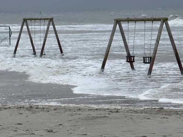 Wasser überflutete den Strand und umspülte Kinderschaukeln.