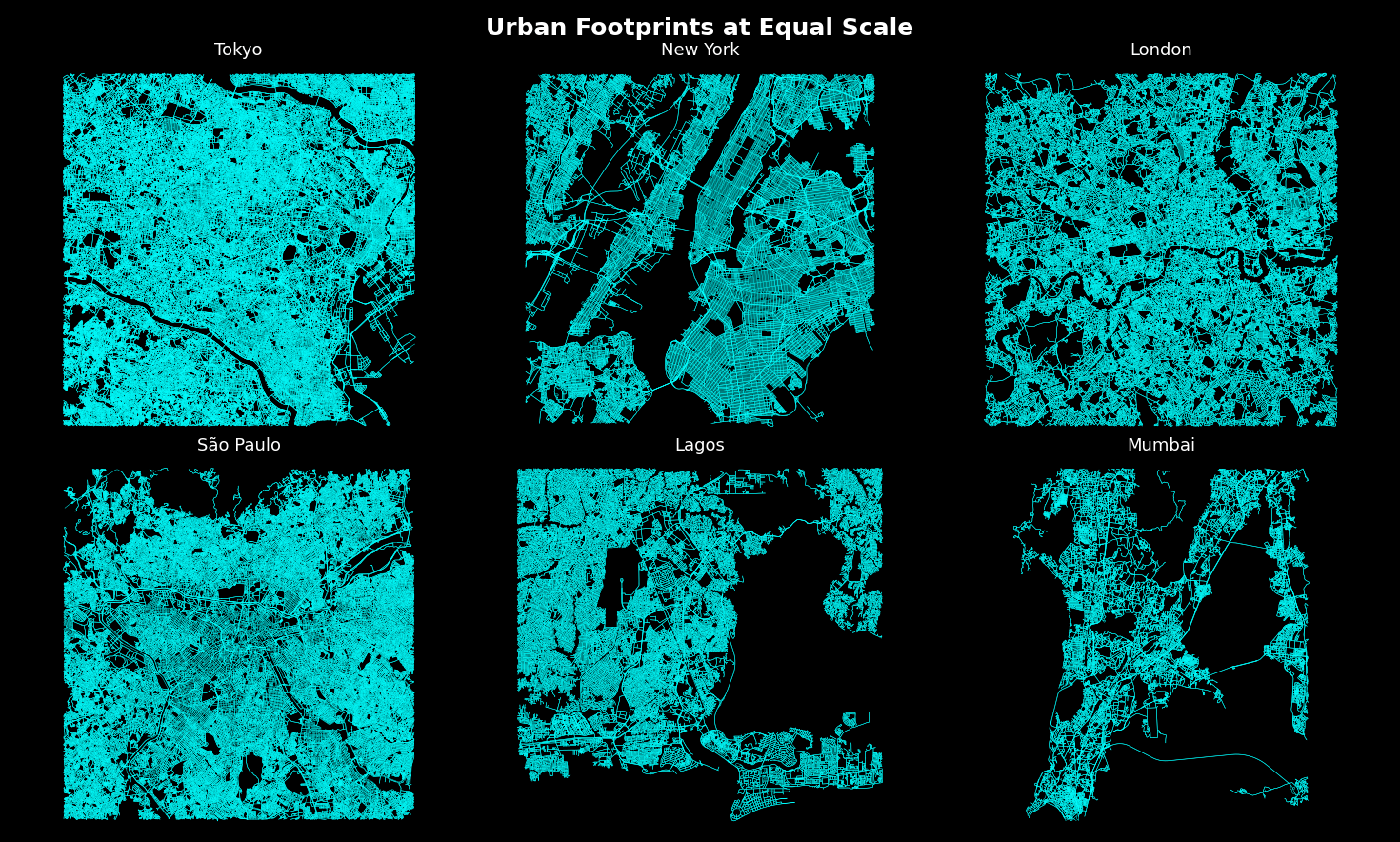 Each panel shows a 7 km around the city center. All of them have the same zoom so you can compare each city. Each of those thin blue lines is a road