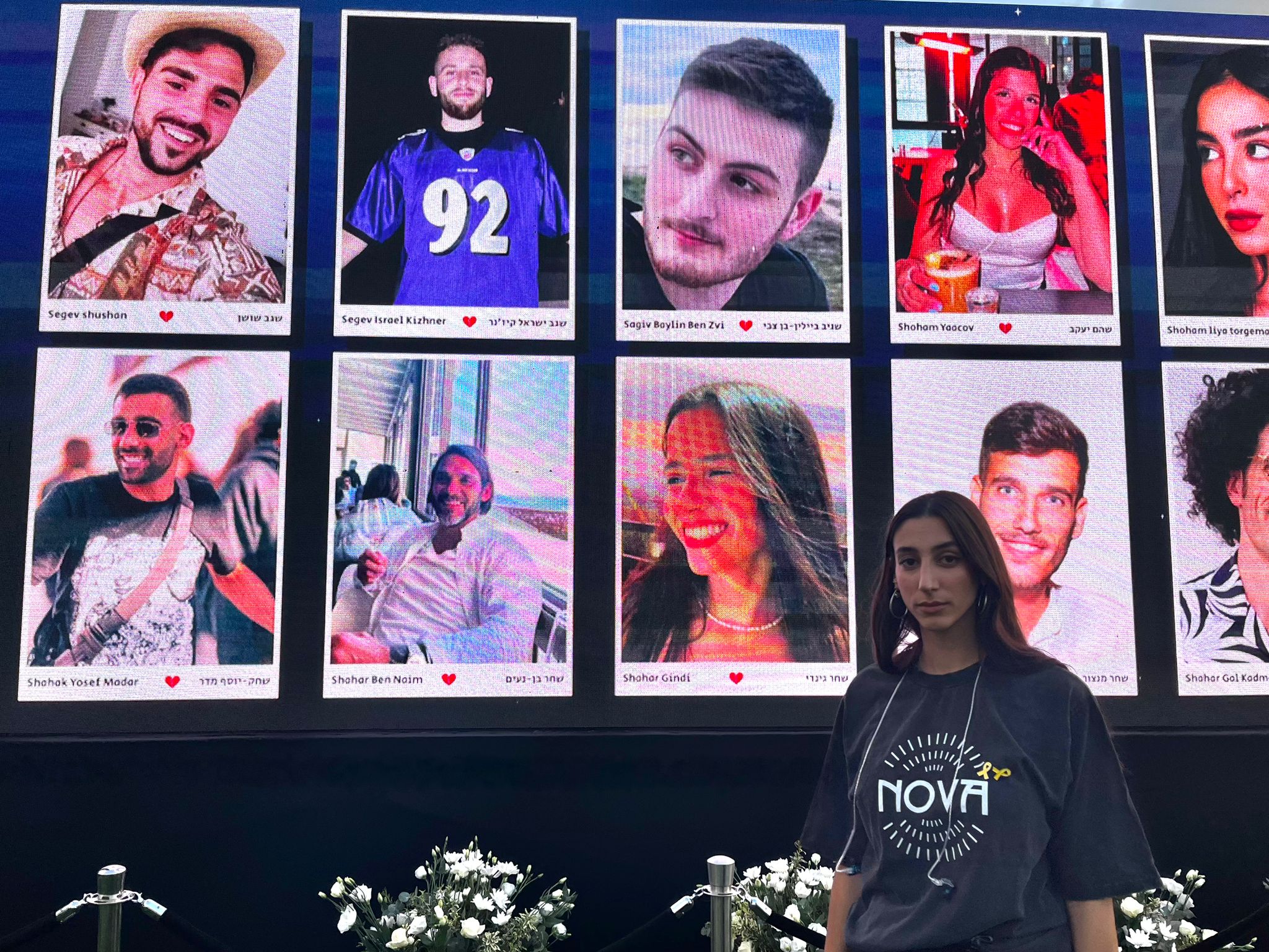 Nova survivor Tali Binner stands in front of pictures of those killed during Hamas’s October 7, 2023, massacre, October 5, 2025. (Stav Levaton/Times of Israel)