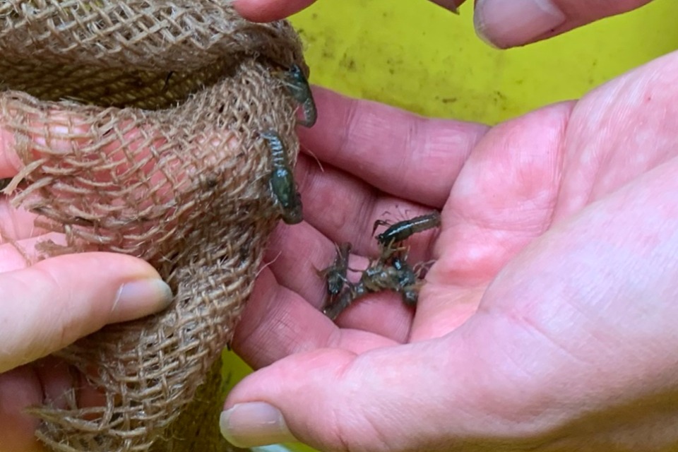 The image shows some of the baby crayfish about to be released into the river.