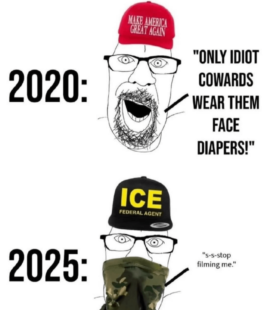 I don’t really get the idea of them wearing masks now as i assume that they don’t feel like they are in the wrong but there must be some level of self awareness that is making them wear them.