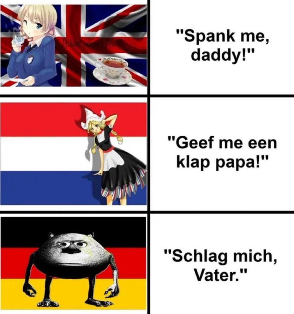 🧸 by BannedBecausePutin Tags:2 Western Europe 4u2WesternEurope4uEurope 26 comments *Schlag mich Vater, das ist ein Befehl! Fotz mi her, Voter We don’t say stuff like that. We’re the daddy/papa in these situations. Yes. Even our women. Hau mich Papi. Better? gib mir einen klaps papi wäre ja auch zu einfach It’s true, dirty talk isn’t a strong suit of the german language. That being said, the translation is inaccurate. It says “Hit me, father”, which doesn’t even sound hot in english. There’s something so inescapably German about that face. It just works, and I don’t know why. Bring on ze wet celery! Goor Gi meg en klapp pappi jeg var ei ond jente Deixade de pensar co pixo. This sub was supposed to be racismo, not porn The very rare occasion where Dutch is great to use. It’s not really what we say. ‘Een klap’ would be a singular punch; something Mike Tyson would give you, if you make fun of his voice. “Sla op mijn billen totdat ze roder zijn dan een tomaat!” Would be more fitting. Op mijn billetjes, papa! Vater! Du warst nie für mich da! “Daska mig farsan” Now I need to go scrub myself with Svinto Southern Luigis would win this contest in a hurry. Dirty talking is sacred to us. US: “Beat me up, motherfucker” Gib mir ein’n Klapps, Pappi There you don’t need to make it sound more scary Isn’t the german correctly translated: ,,Gib mir eine Klatsche, Papa.” if I take the dutch sentence as a template? Ik it should sound funny but c’mon. Lyö minua, isä. Hetalia in this day and age?  Bestrafe mich, bestrafe mich… Versohlt mir den hintern, Papa The fact that something from r/lustig gets reposted here disgusts me . Comments are closed.