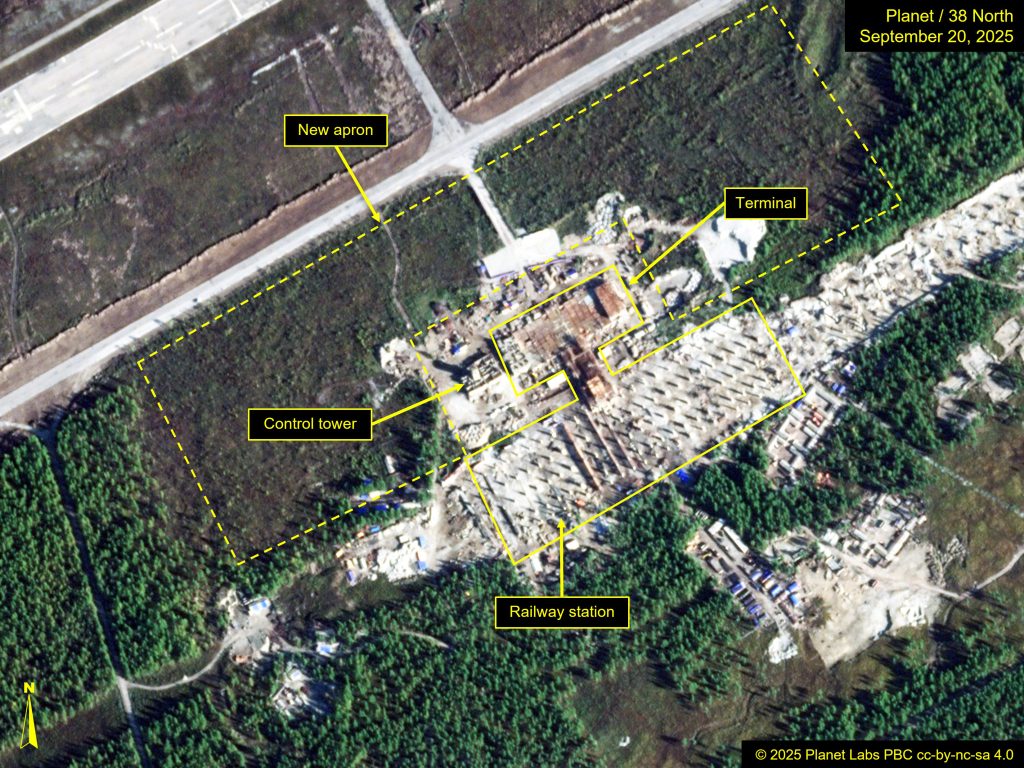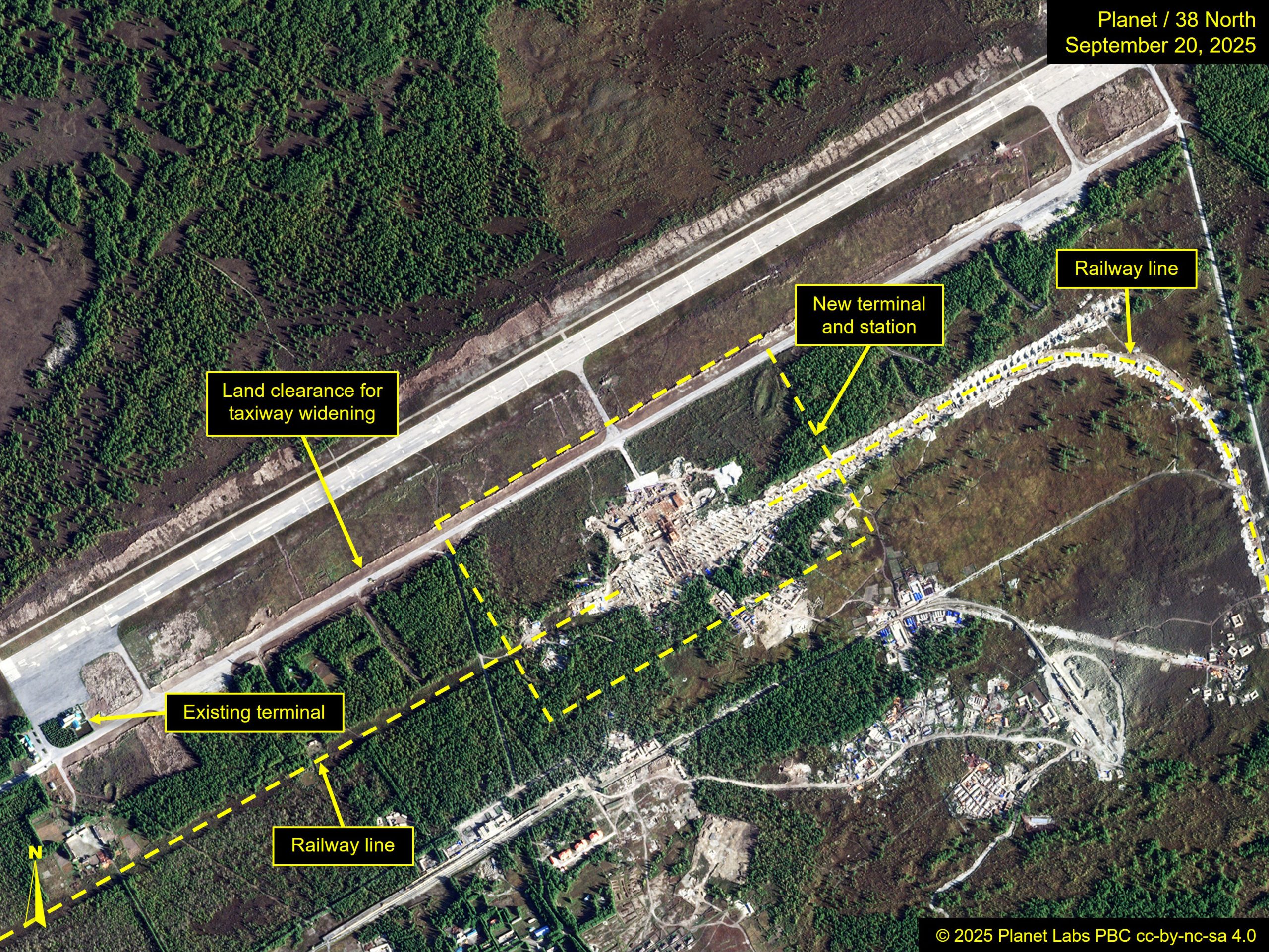 Figure 2. Construction on a new terminal and railway station at Samjiyon Airfield reflect progress to transform the airfield into North Korea’s third modern commercial airport. Image © 2025 Planet Labs, PBC cc-by-nc-sa 4.0. For media licensing options, please contact [email protected].