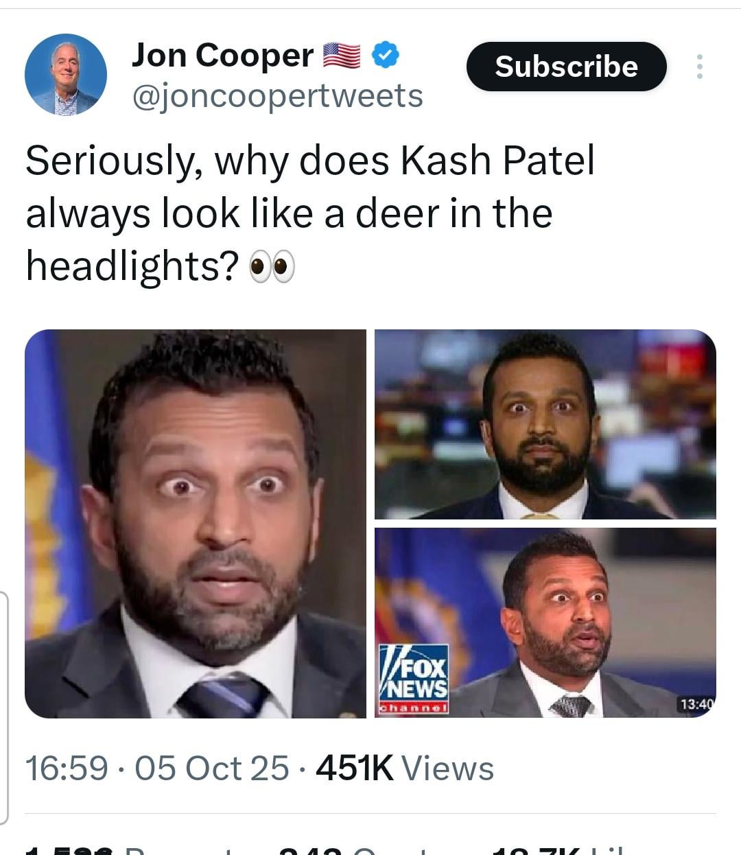 2. Because he’s absolutely clueless and has no business being in that position and nobody knows that more than Kashout Patel, so you are literally seeing a deer caught in headlights