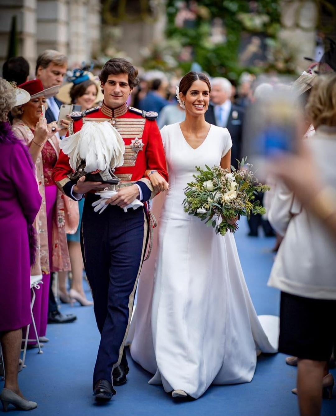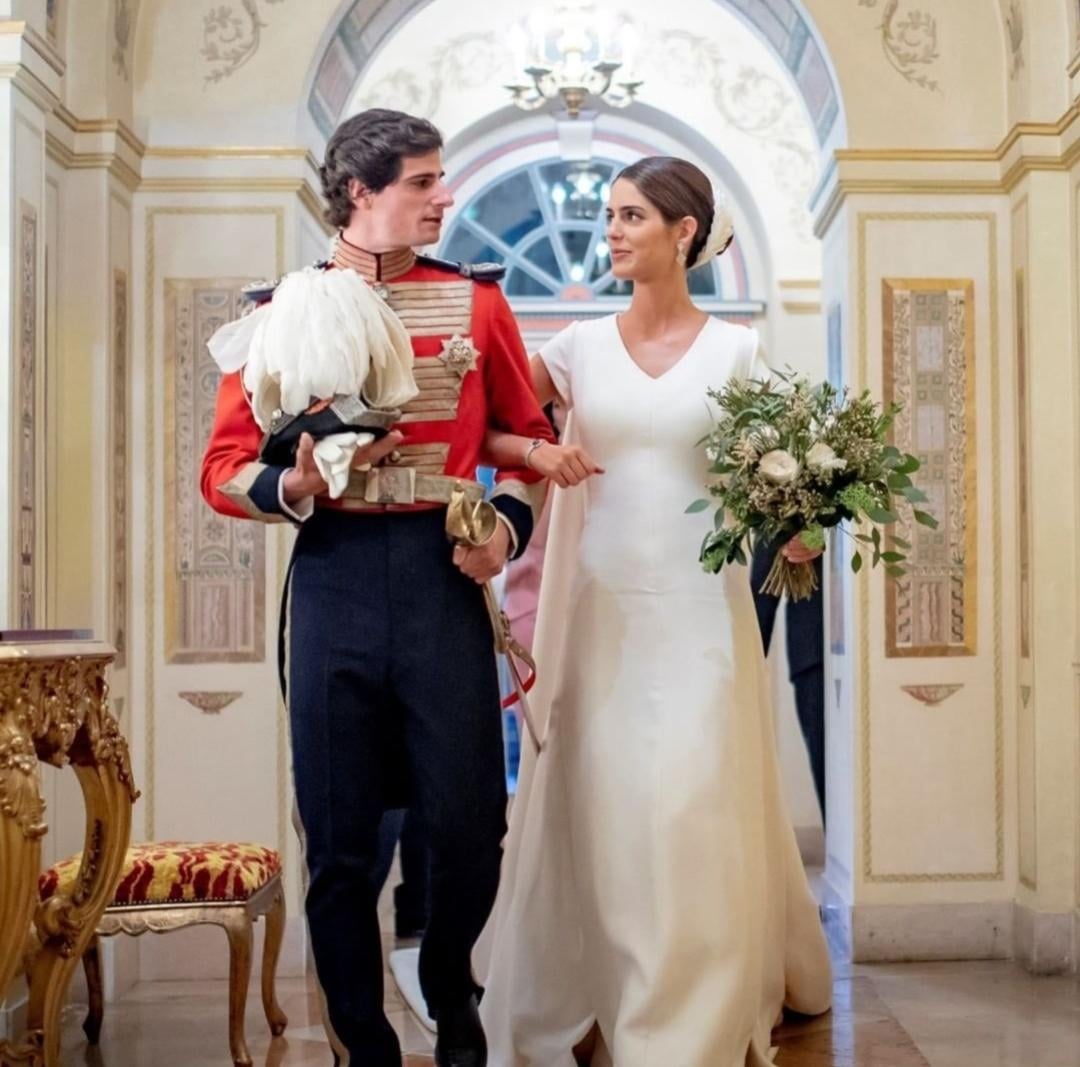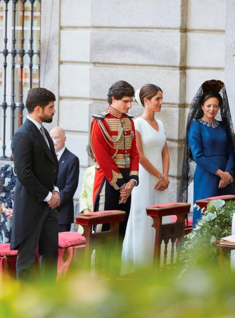 The groom wore the uniform of the Royal Cavalry Armory of Seville and the bride wore a dress made by her aunt, fashion designer Teresa Palazuelo.