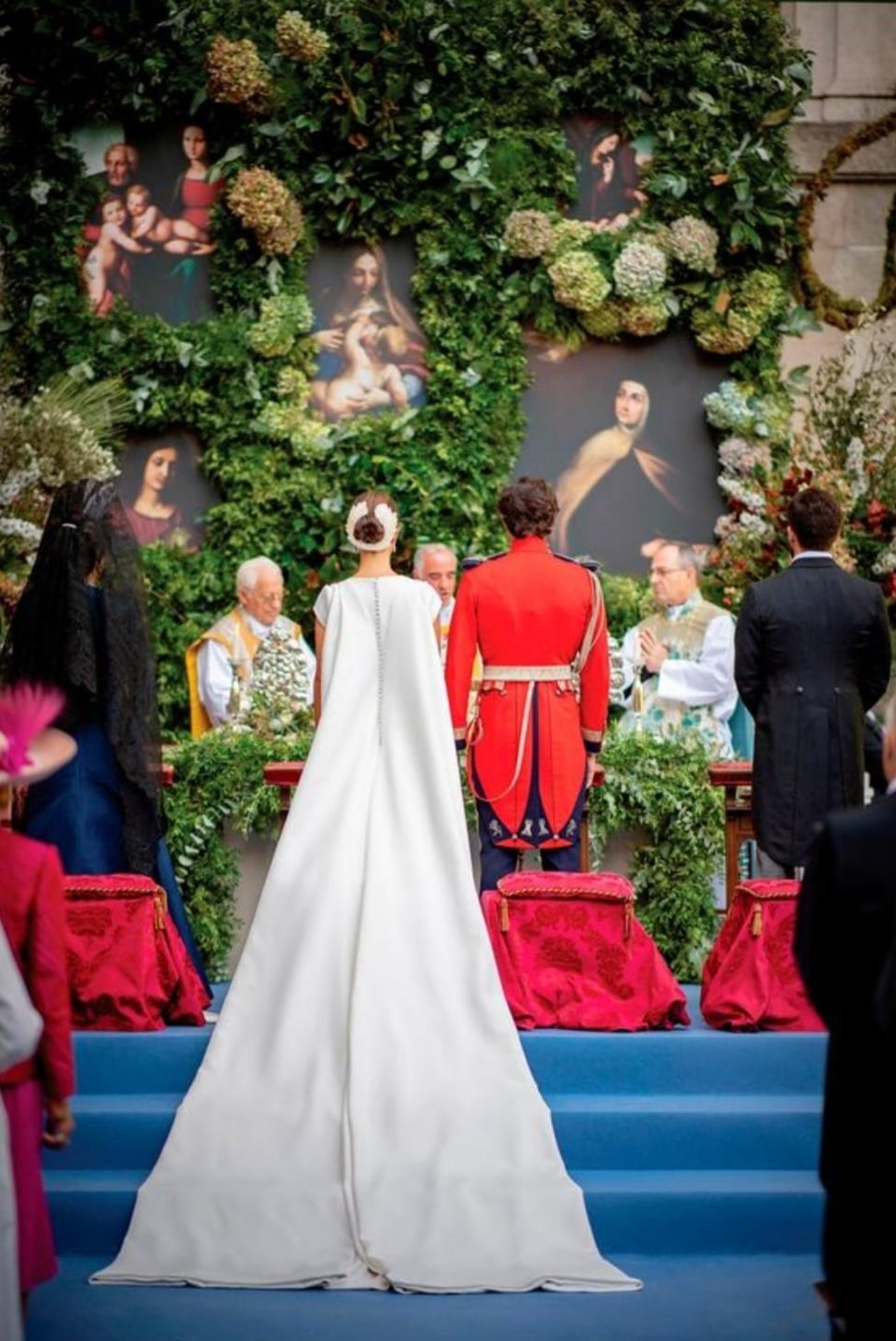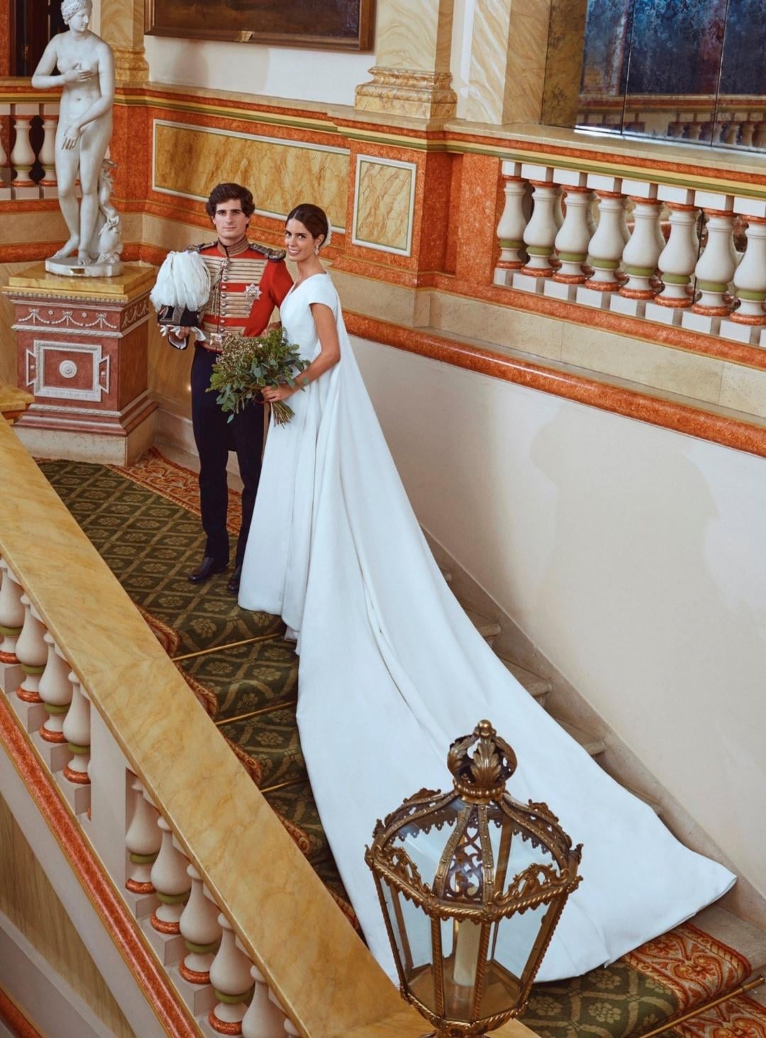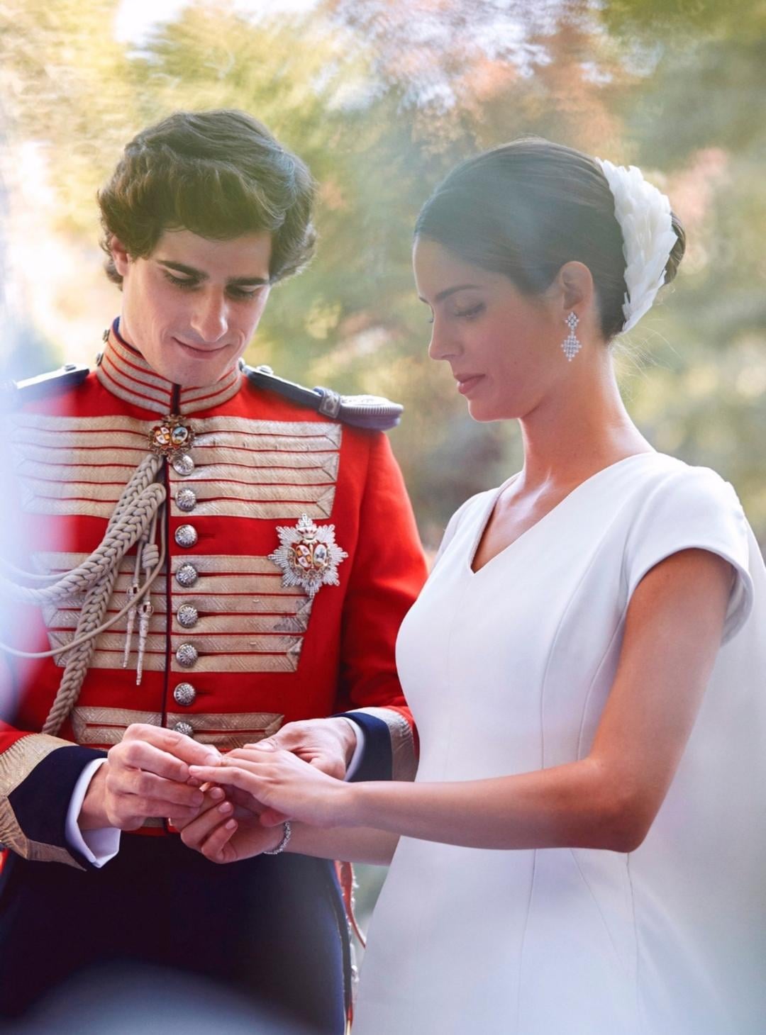The groom wore the uniform of the Royal Cavalry Armory of Seville and the bride wore a dress made by her aunt, fashion designer Teresa Palazuelo.