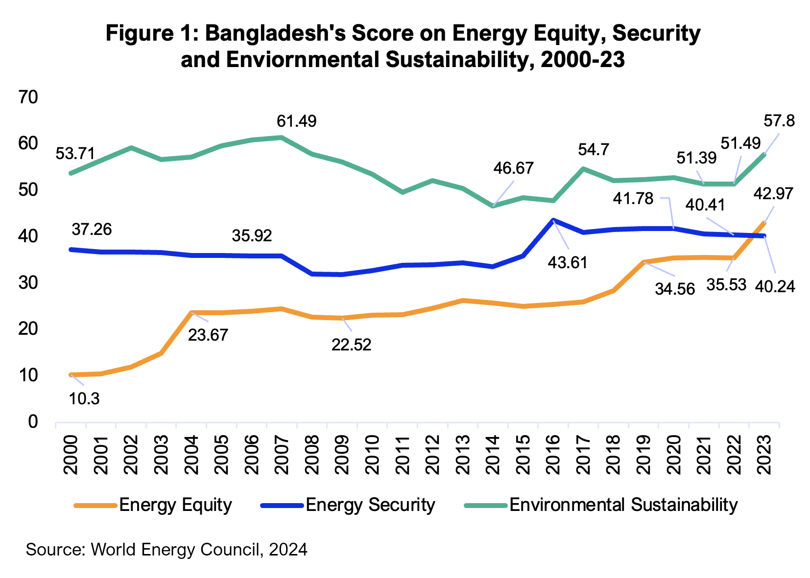 The WEC recognised Bangladesh as one of the top-performing nations on energy equity as its score quadrupled between 2000 and 2023 (see Figure 1), as a result of increased power generation capacity. However, high generation costs prompted the Bangladesh government to increase power tariffs four times between January 2023 and March 2024. This made electricity over 20% more expensive at the retail level. The country also experienced load shedding on at least 23 days in 9 months of the fiscal year (FY) 2023-24.