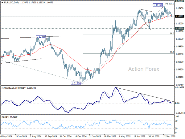 In the bigger picture, rise from 1.0176 (2025 low) is seen as the third leg of the pattern from 0.9534 (2022 low). 100% projection of 0.9534 to 1.1274 from 1.0176 at 1.1916 was already met. For now, further rally will remain in favor as long as 1.1390 support holds, and firm break of 1.2000 psychological level will carry larger bullish implications. However, firm break of 1.1390 will suggest that rise from 1.0176 has already completed and bring deeper fall to 55 W EMA (now at 1.1265).