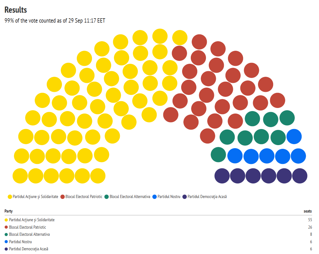 The Party of Action and Solidarity (PAS) won 50.2% of the votes and 55 of 101 seats in the parliamentary election, despite alleged interference by Moscow. The pro-Russian Patriotic Electoral Bloc (PEB) received 24.2% of the vote on September 28.